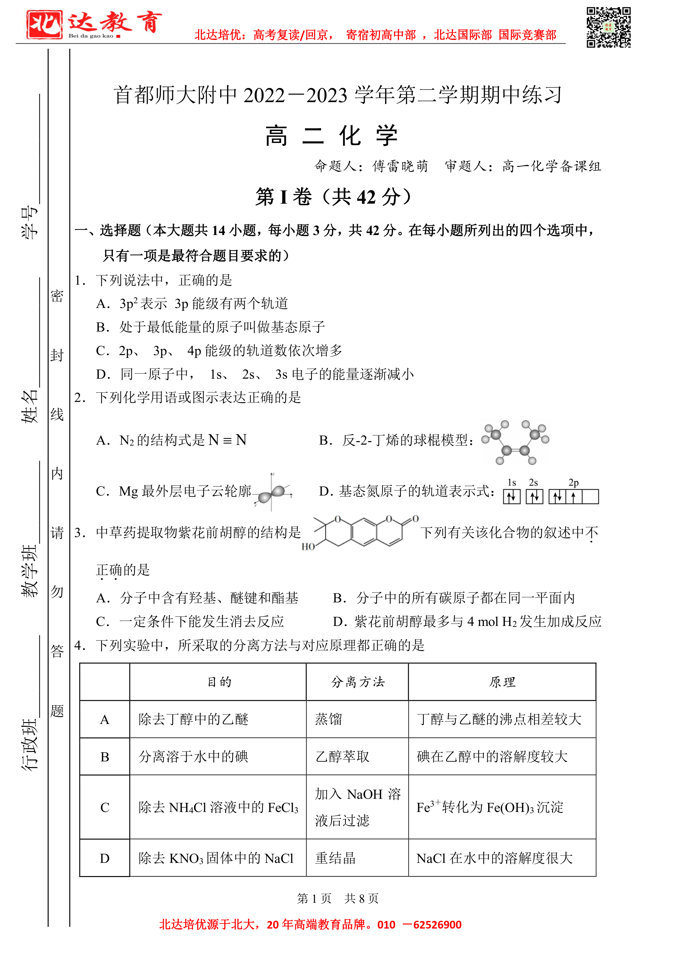2022-2023学年北京各区高二年级下学期期中考试已开始,admw360高考复读学校整理了2022-2023学年北京首师大附中高二(下)期中化学试题及答案,供同学们在线下载!