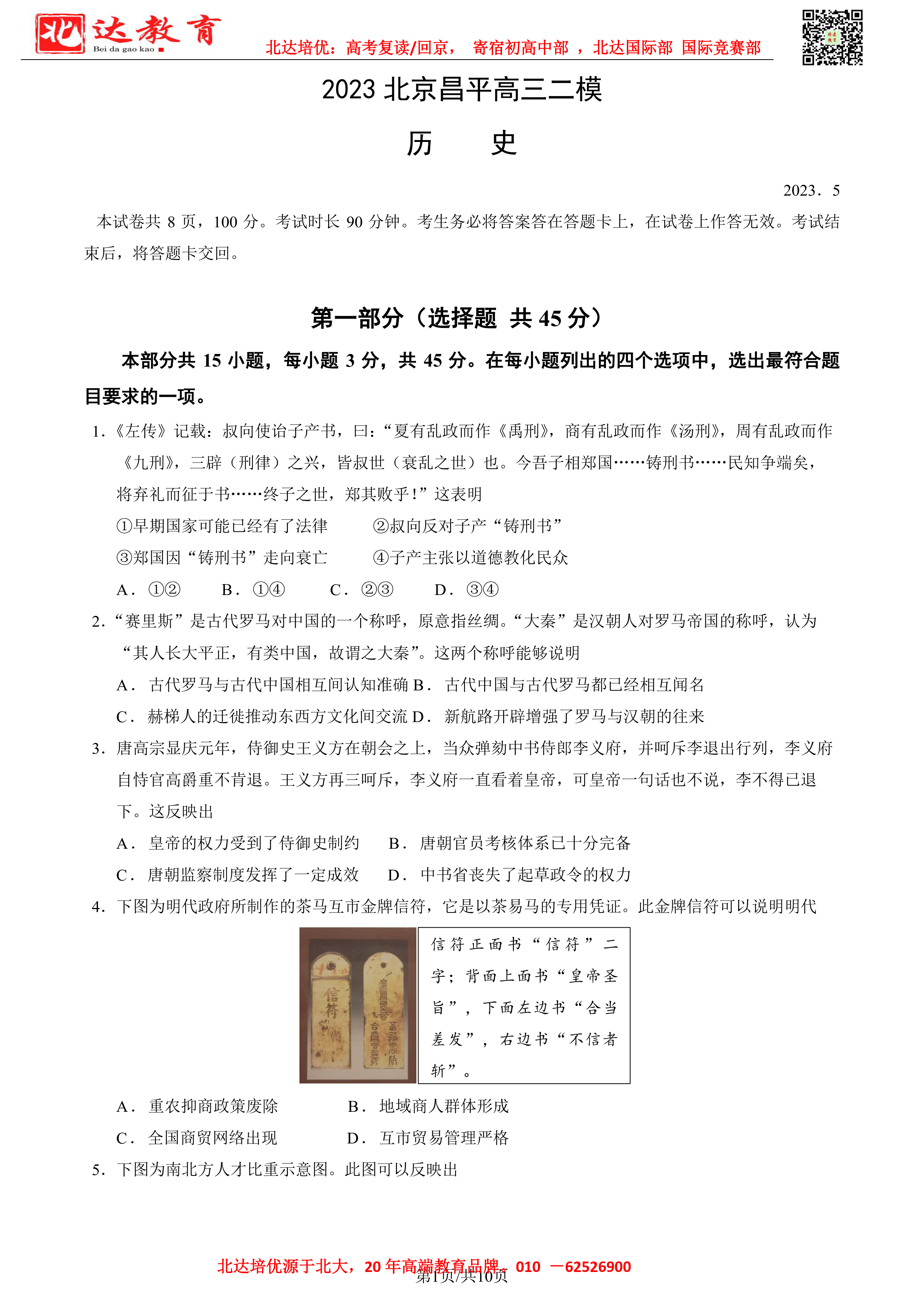 2023年北京昌平区高三二模考试预于5月初进行,为了方便同学们查找相关试题及答案,admw360高考复读学校整理了2023年北京昌平区高三二模历史试题及答案,附高清电子版,欢迎为大家下载分享~
