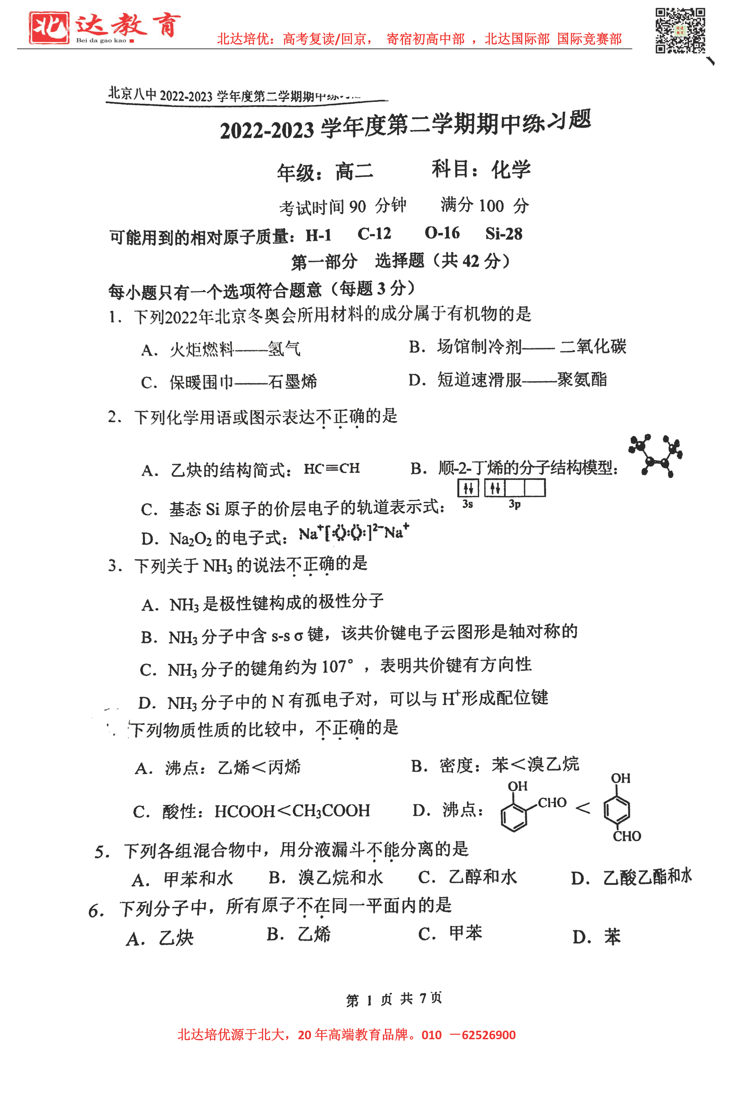 2022-2023学年北京各区高二年级下学期期中考试已开始,admw360高考复读学校整理了2022-2023学年北京八中高二(下)期中化学试题,供同学们在线下载!