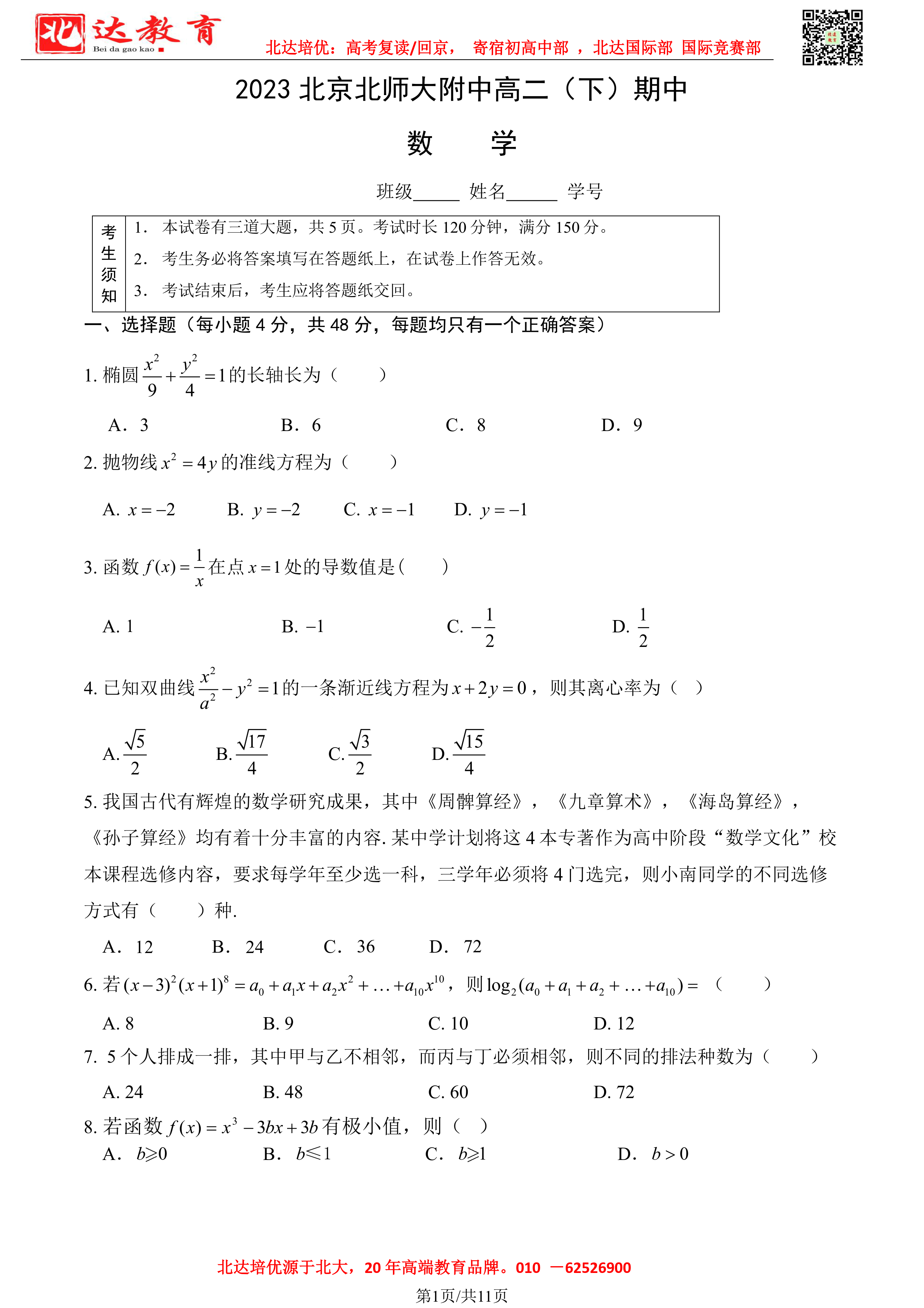 2022-2023学年北京各区高二年级下学期期中考试已开始,admw360高考复读学校整理了2022-2023学年北师大附中高二(下)期中数学试题及答案,供同学们在线下载!