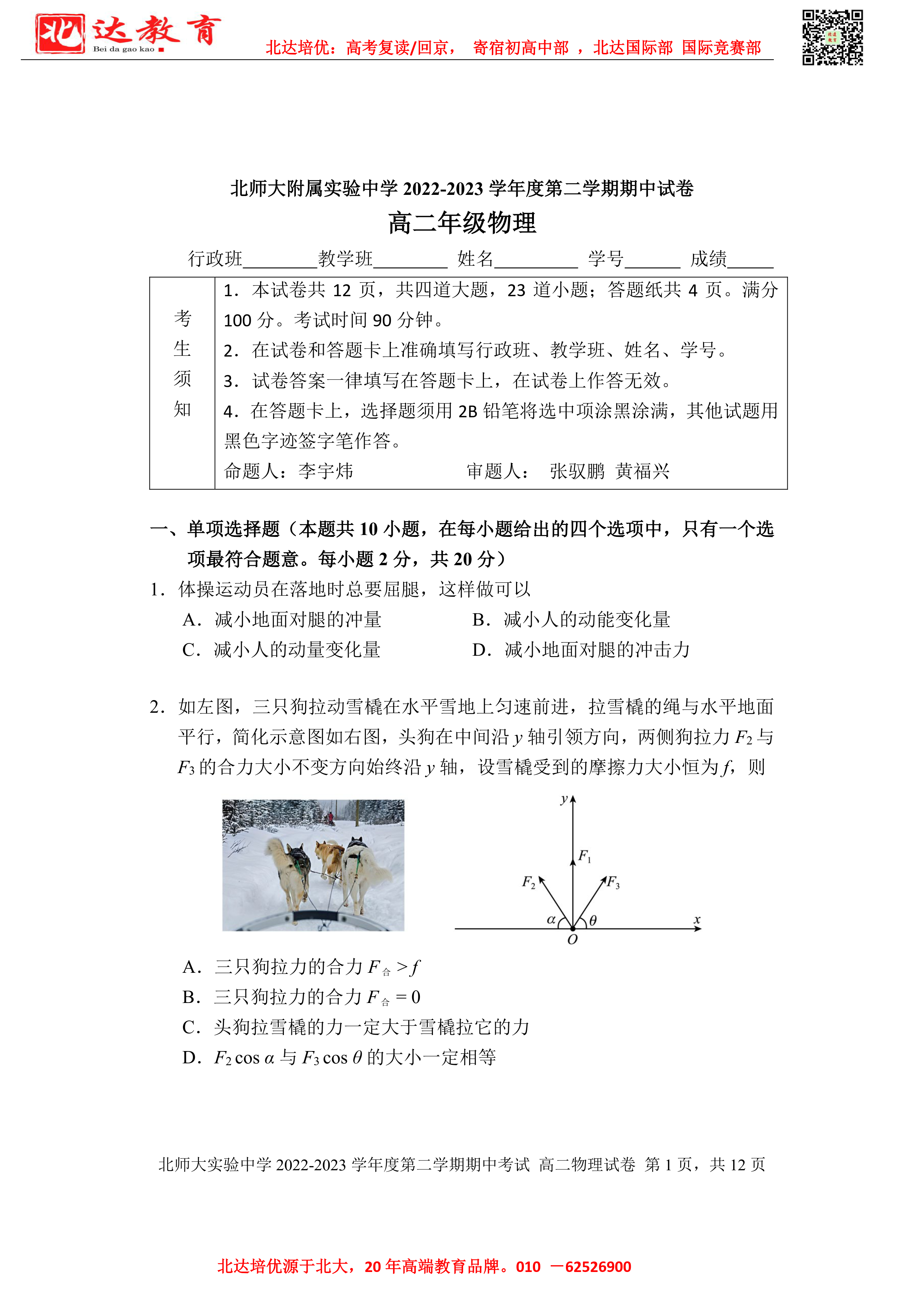2022-2023学年北京各区高二年级下学期期中考试已开始,admw360高考复读学校整理了2022-2023学年北京北师大实验中学高二(下)期中物理试题及答案,供同学们在线下载!