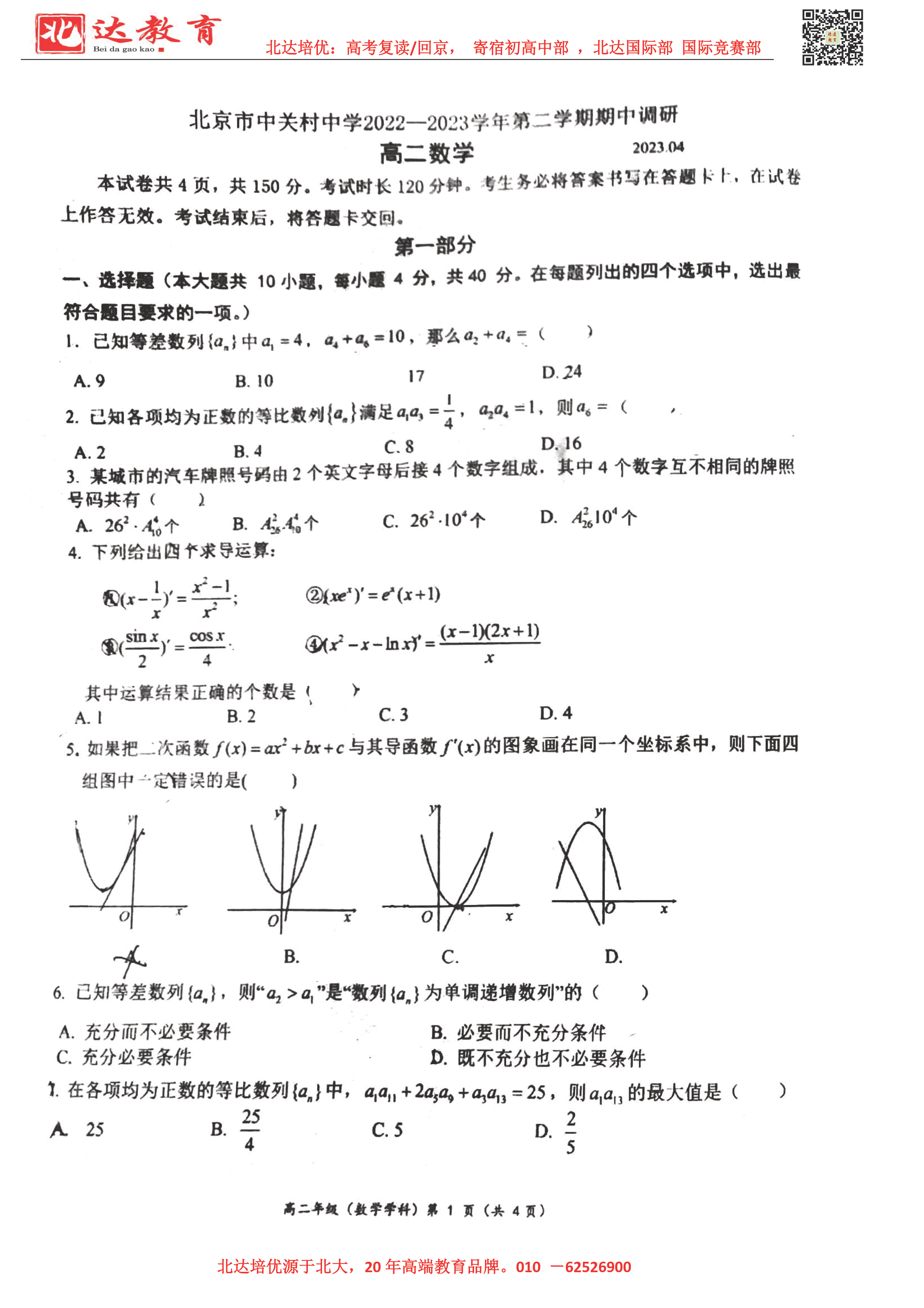 2022-2023学年北京各区高二年级下学期期中考试已开始,admw360高考复读学校整理了2022-2023学年北京中关村中学高二(下)期中数学试题及答案,供同学们在线下载!