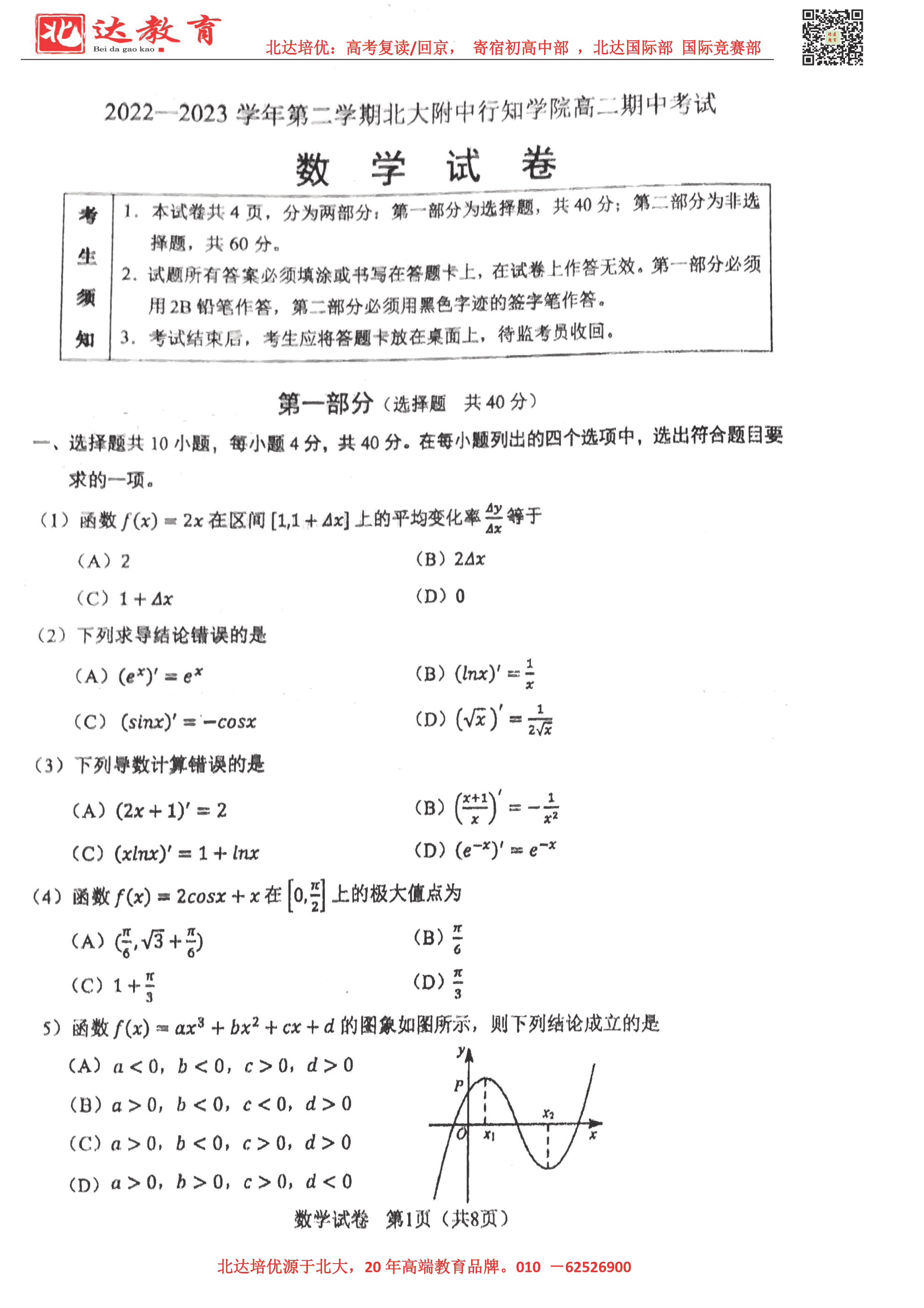 2022-2023学年北京各区高二年级下学期期中考试已开始,admw360高考复读学校整理了2022-2023学年北大附中高二(下)期中数学试题,供同学们在线下载!