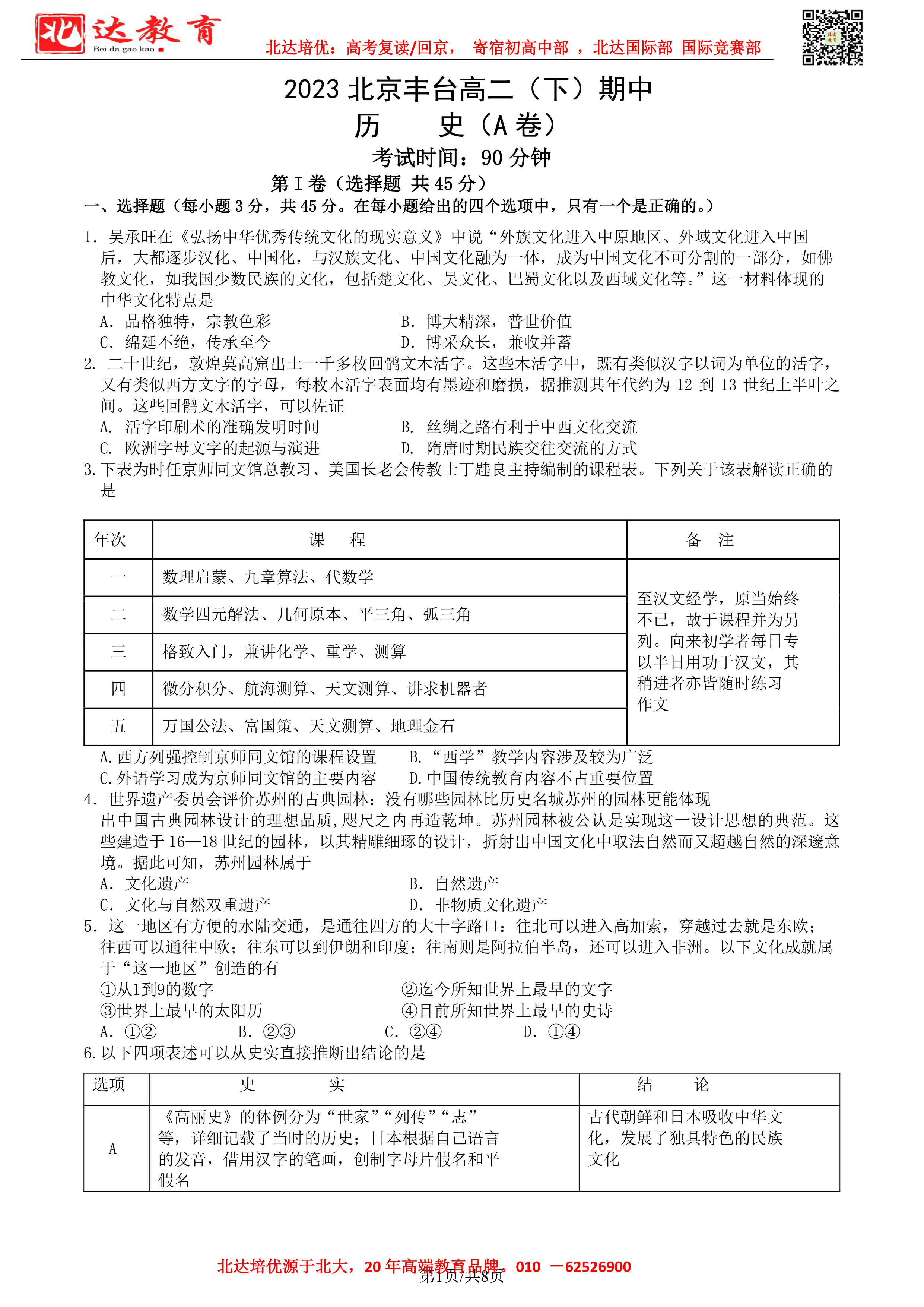 2022-2023学年北京各区高二年级下学期期中考试已开始,admw360高考复读学校整理了2022-2023学年北京丰台高二(下)期中历史(A卷)试题及答案,供同学们在线下载!