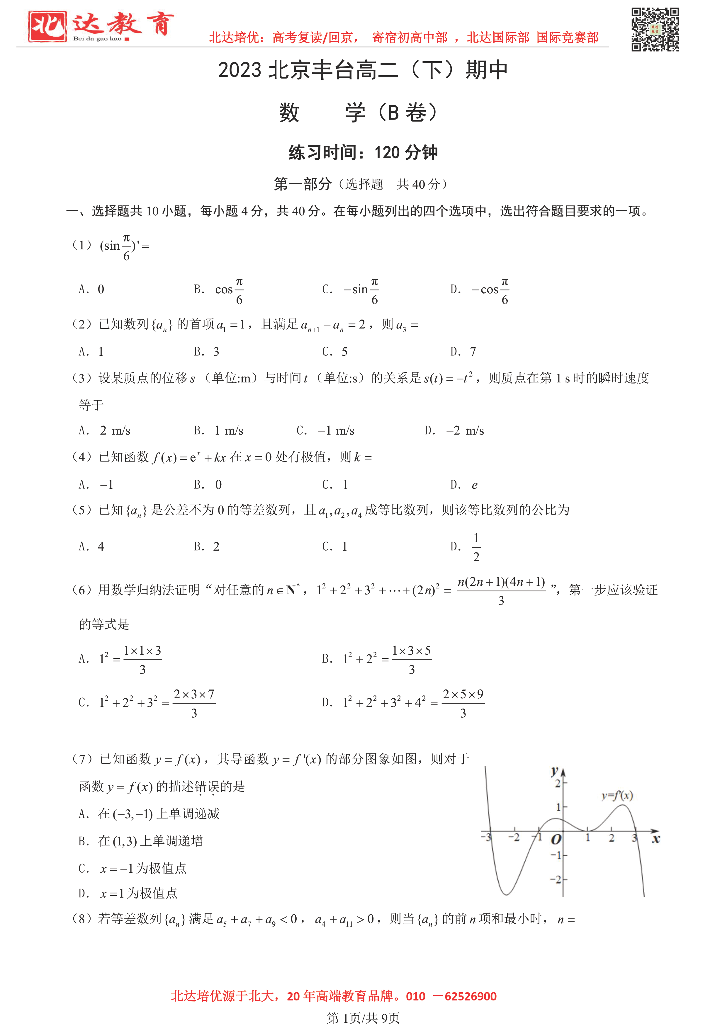2022-2023学年北京丰台高二(下)期中数学(B卷)试题及答案