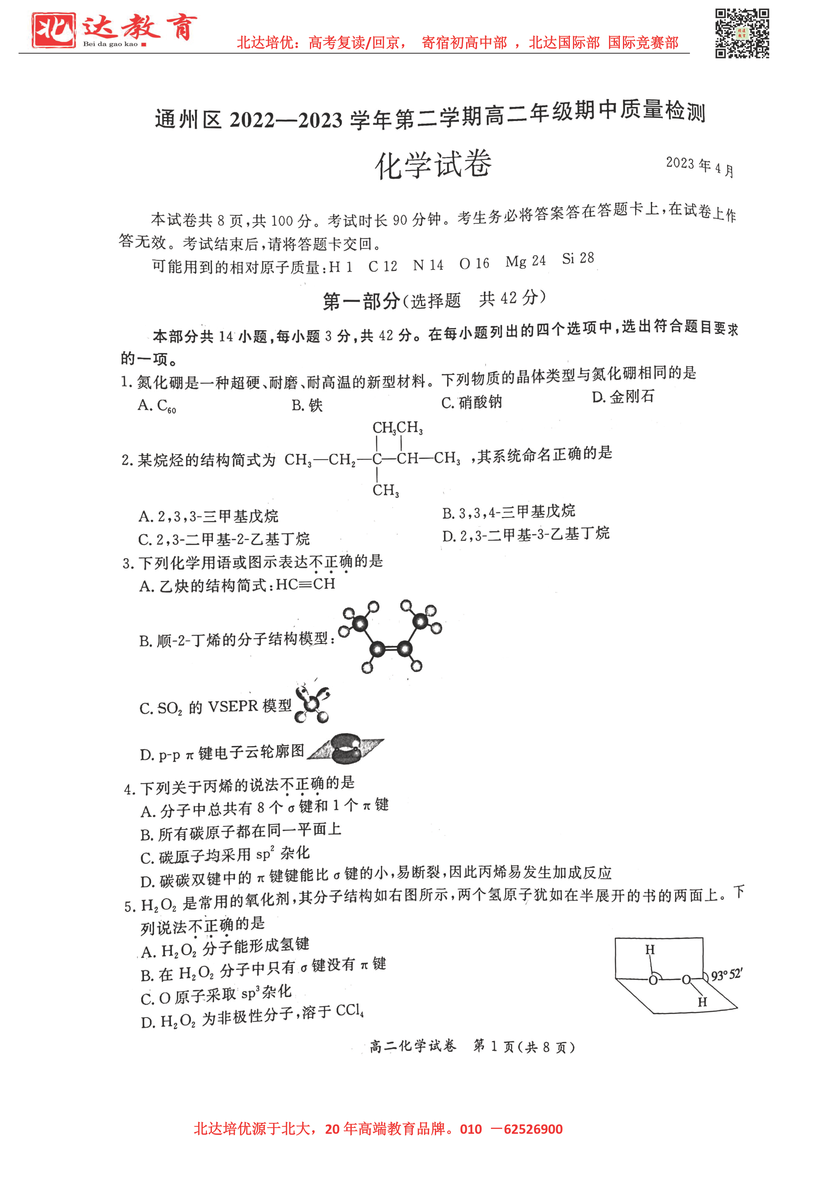 2022-2023学年北京各区高二年级下学期期中考试已开始,admw360高考复读学校整理了2022-2023学年北京通州高二(下)期中化学试题,供同学们在线下载!