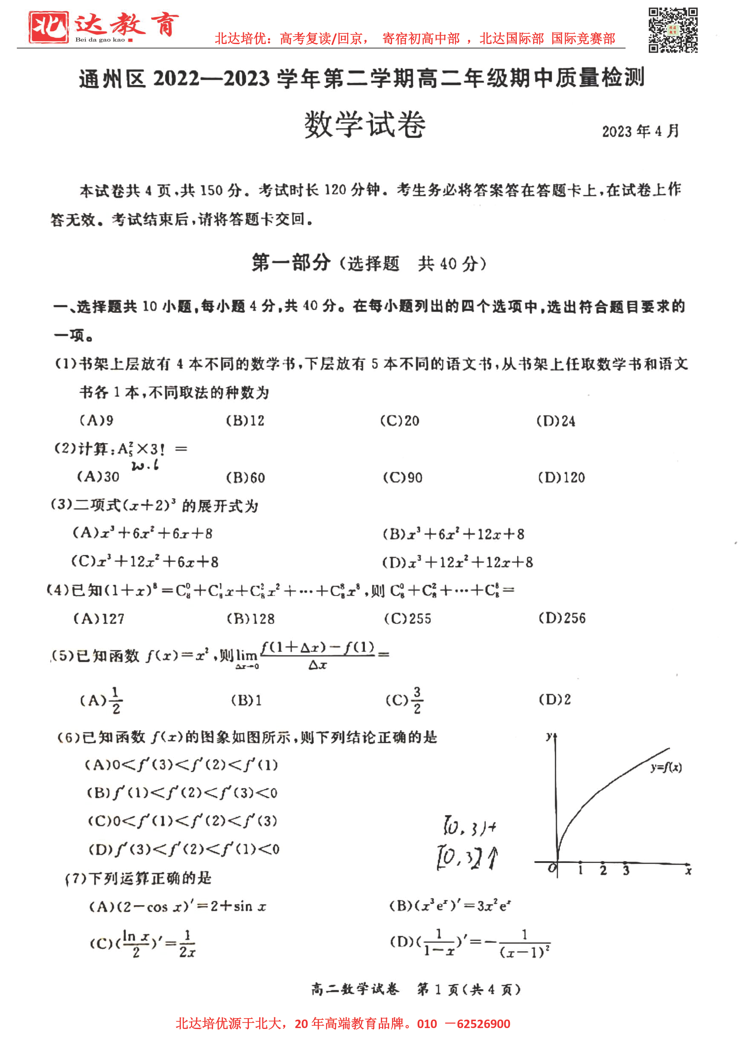 2022-2023学年北京各区高二年级下学期期中考试已开始,admw360高考复读学校整理了2022-2023学年北京通州高二(下)期中数学试题及答案,供同学们在线下载!