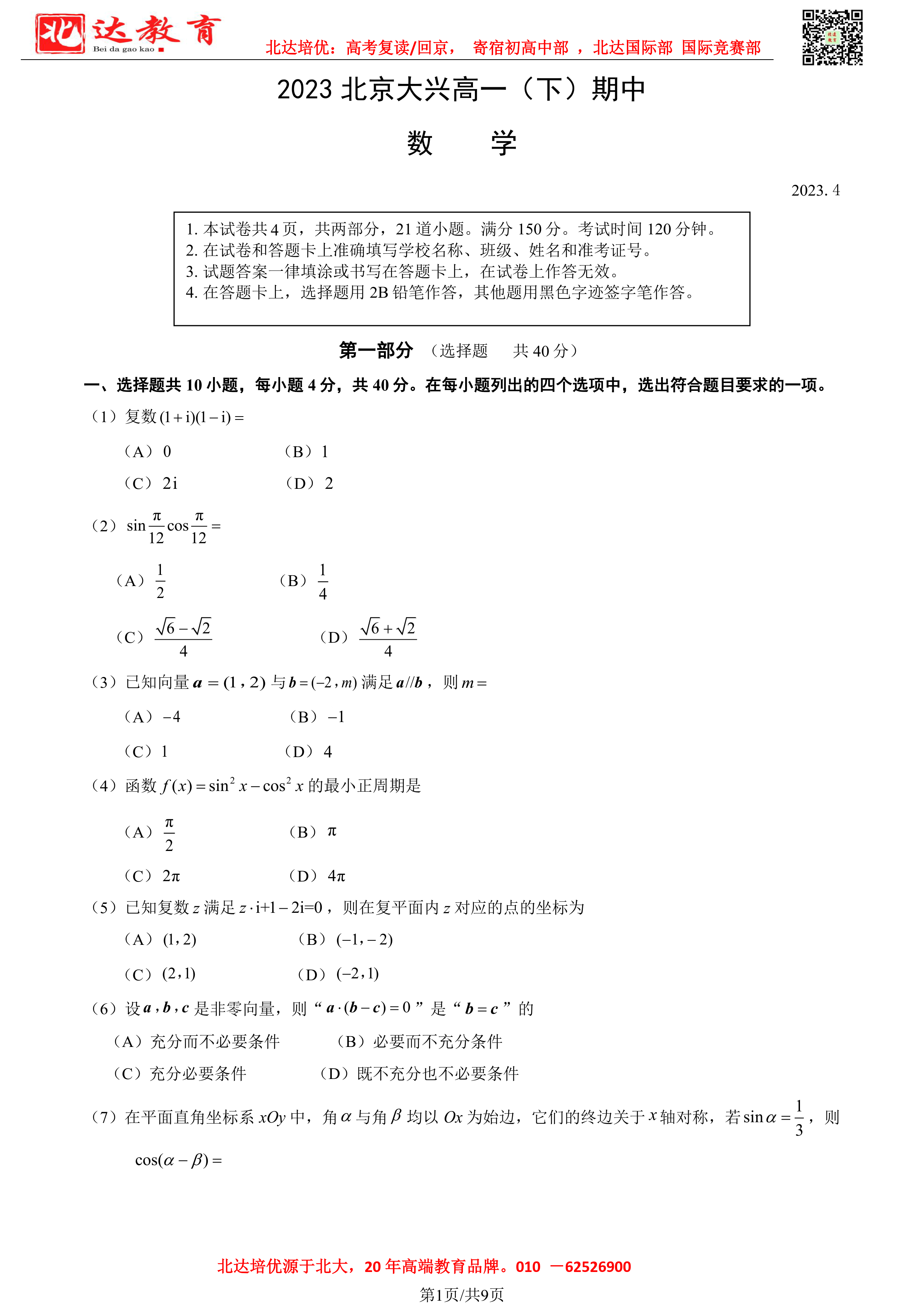 2022-2023学年北京各区高一年级下学期期中考试已开始,admw360高考复读学校整理了2022-2023学年北京大兴区高一(下)期中数学试题及答案,供同学们在线下载!