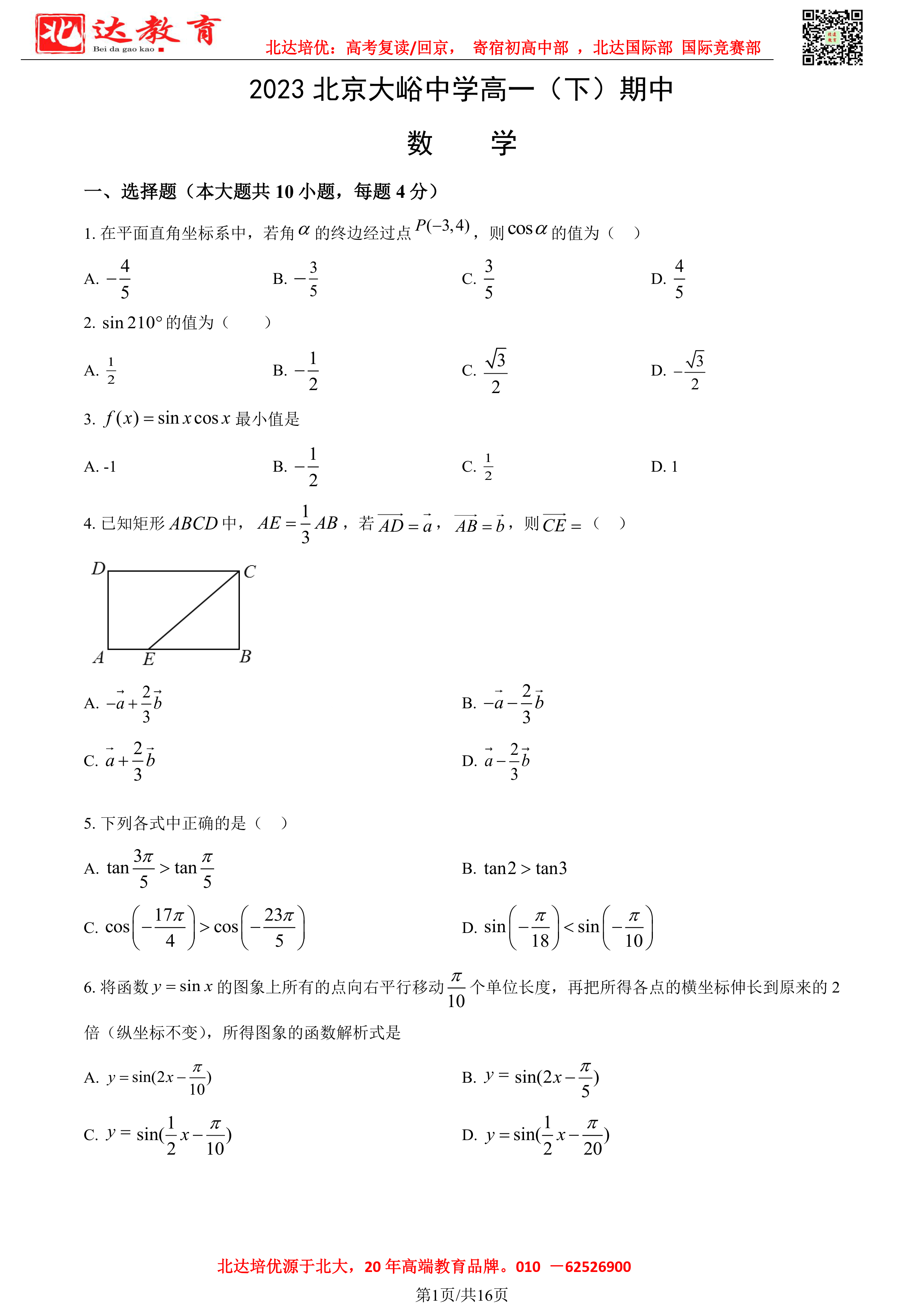 2022-2023学年北京各区高一年级下学期期中考试已开始,admw360高考复读学校整理了2022-2023学年北京大峪中学高一(下)期中数学试题及答案,供同学们在线下载!