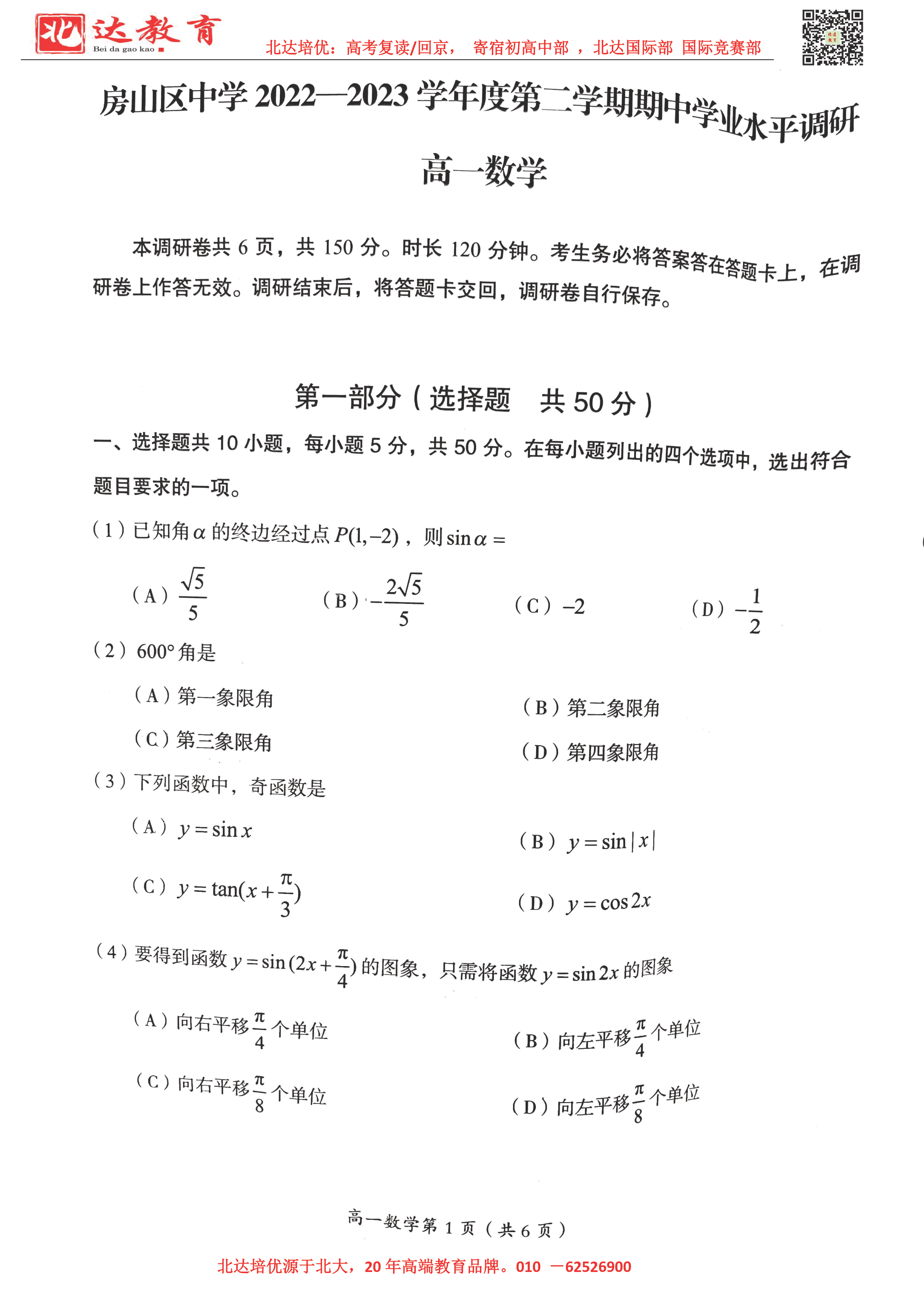 2022-2023学年北京各区高一年级下学期期中考试已开始,admw360高考复读学校整理了2022-2023学年北京房山高一(下)期中数学试题,供同学们在线下载!