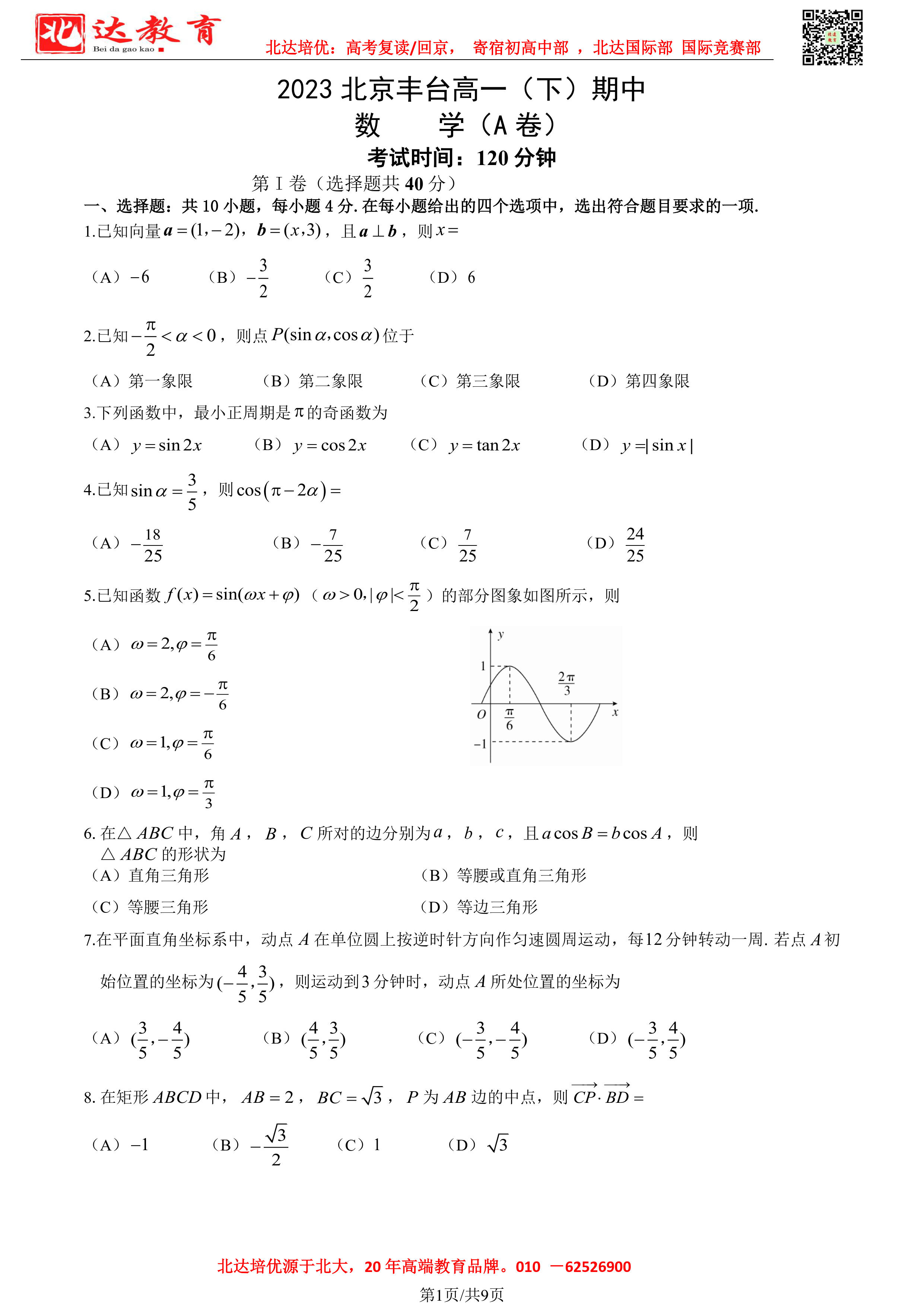 2022-2023学年北京各区高一年级下学期期中考试已开始,admw360高考复读学校整理了2022-2023学年北京丰台高一(下)期中数学(A卷)试题及答案,供同学们在线下载! admw360高中部…
