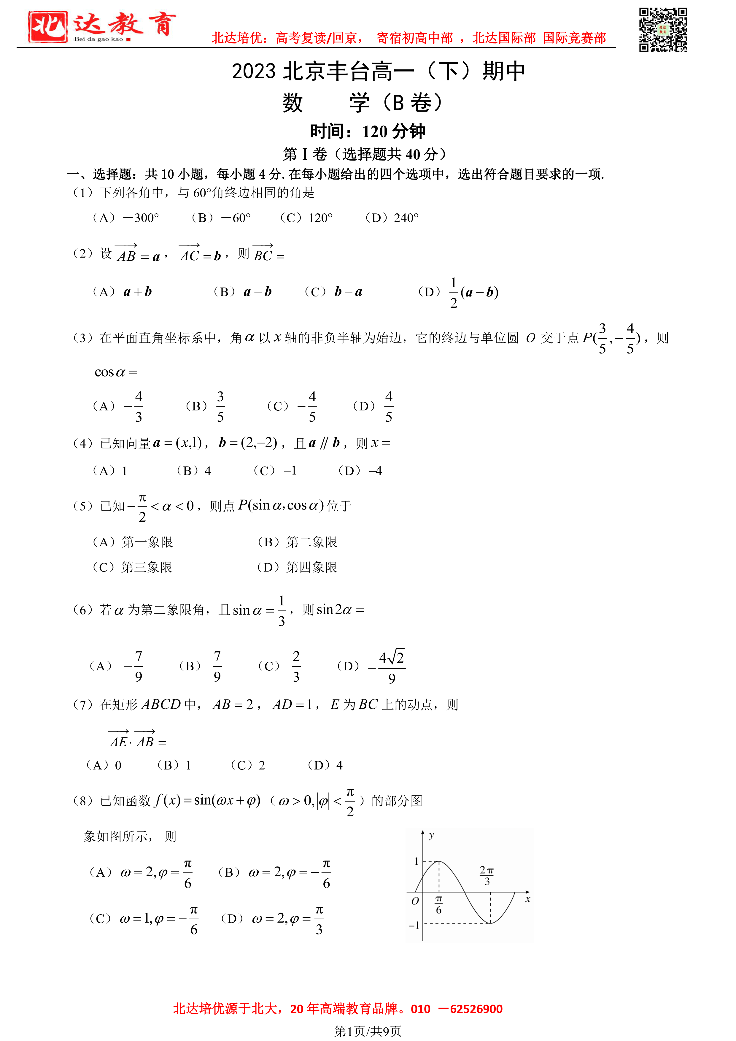 2022-2023学年北京各区高一年级下学期期中考试已开始,admw360高考复读学校整理了2022-2023学年北京丰台高一(下)期中数学(B卷)试题及答案,供同学们在线下载!