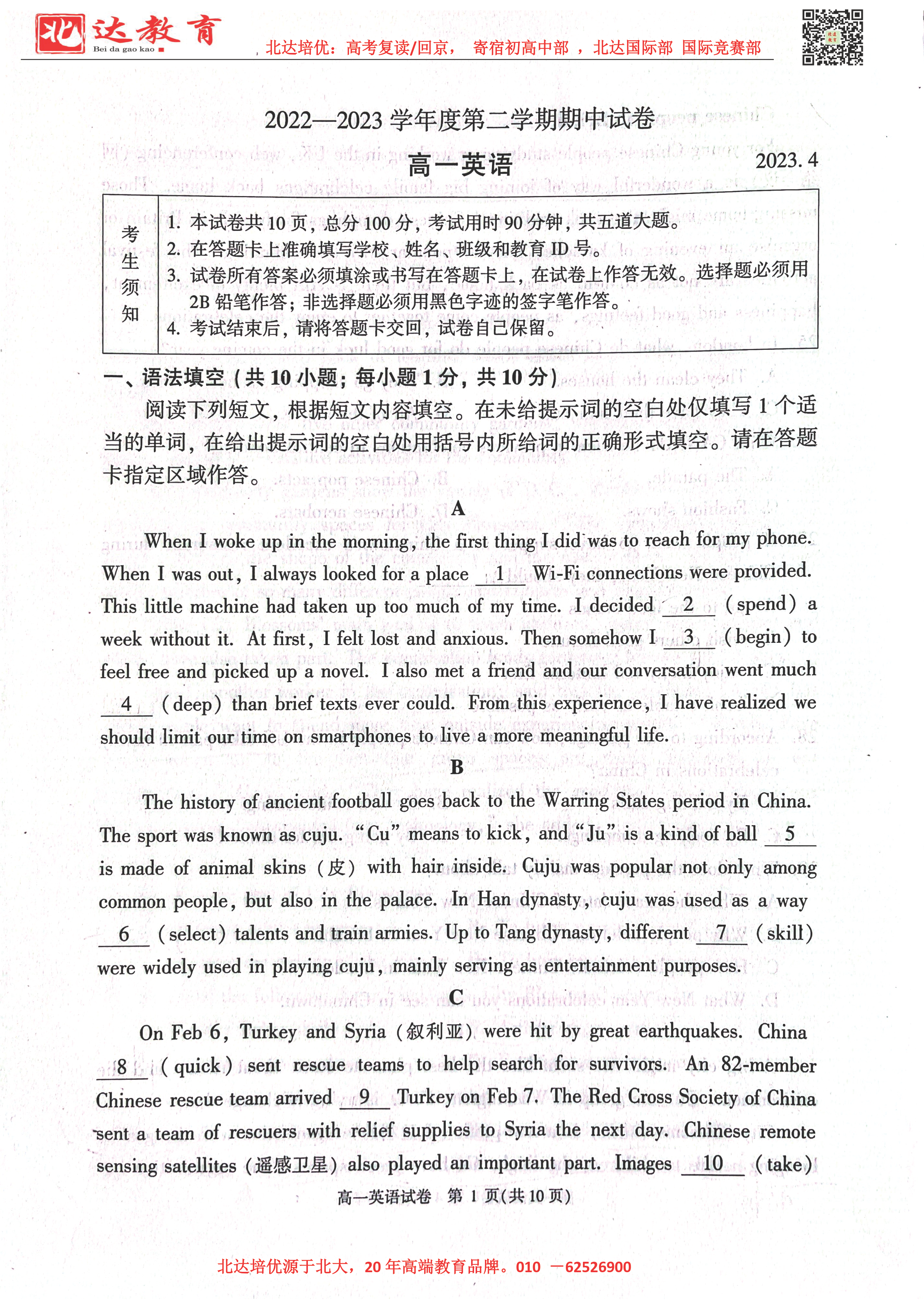 2022-2023学年北京各区高一年级下学期期中考试已开始,admw360高考复读学校整理了2022-2023学年北京顺义高一(下)期中英语试题,供同学们在线下载!