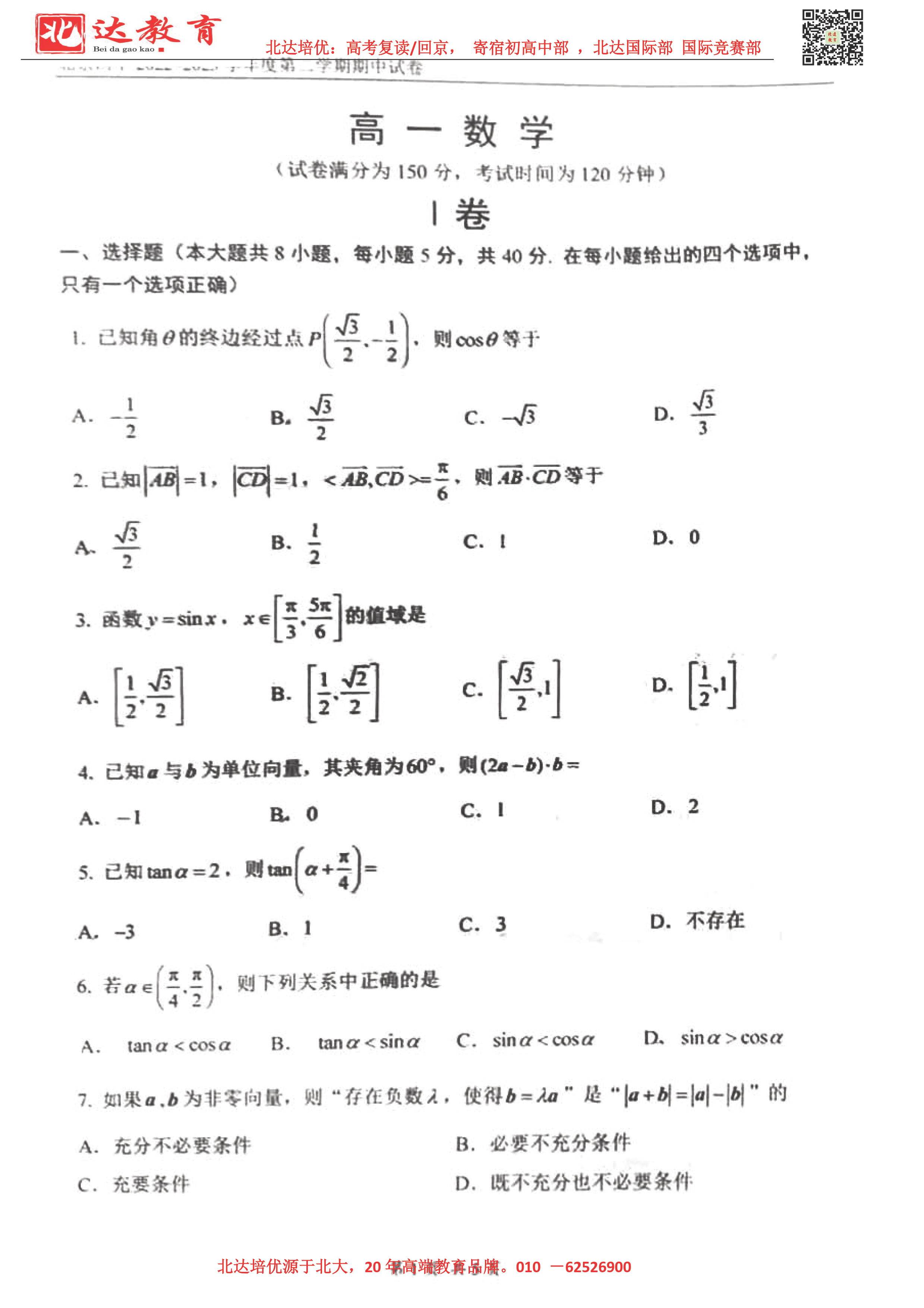 2022-2023学年北京各区高一年级下学期期中考试已开始,admw360高考复读学校整理了2022-2023学年北京四中高一(下)期中数学试题,供同学们在线下载!