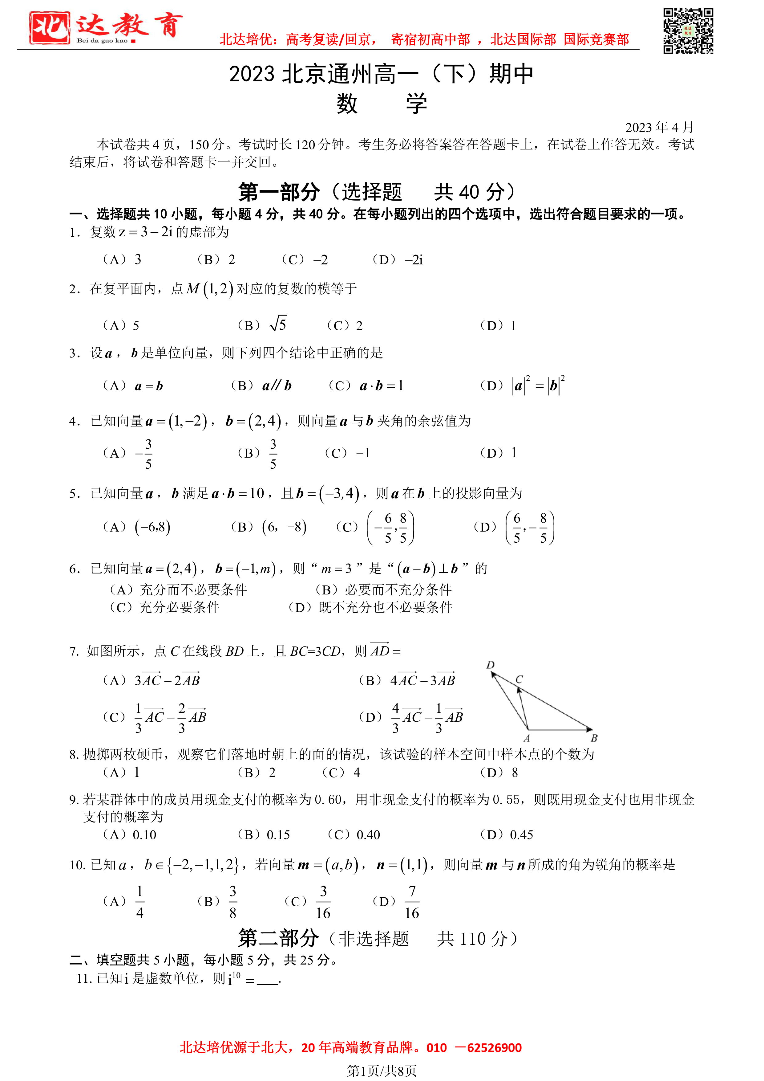 2022-2023学年北京各区高一年级下学期期中考试已开始,admw360高考复读学校整理了2022-2023学年北京通州高一(下)期中数学试题及答案,供同学们在线下载!