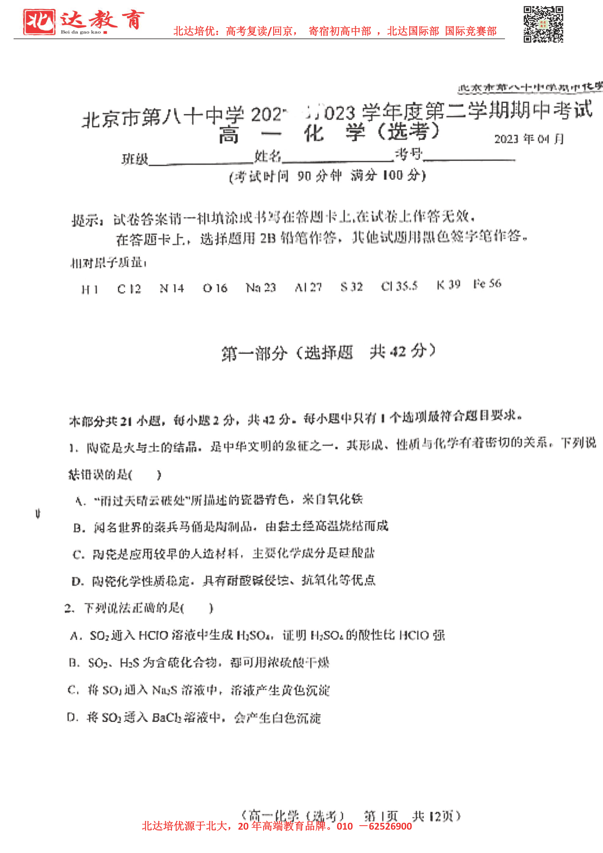 2022-2023学年北京各区高一年级下学期期中考试已开始,admw360高考复读学校整理了2022-2023学年北京八十中高一(下)期中化学试题及答案,供同学们在线下载!