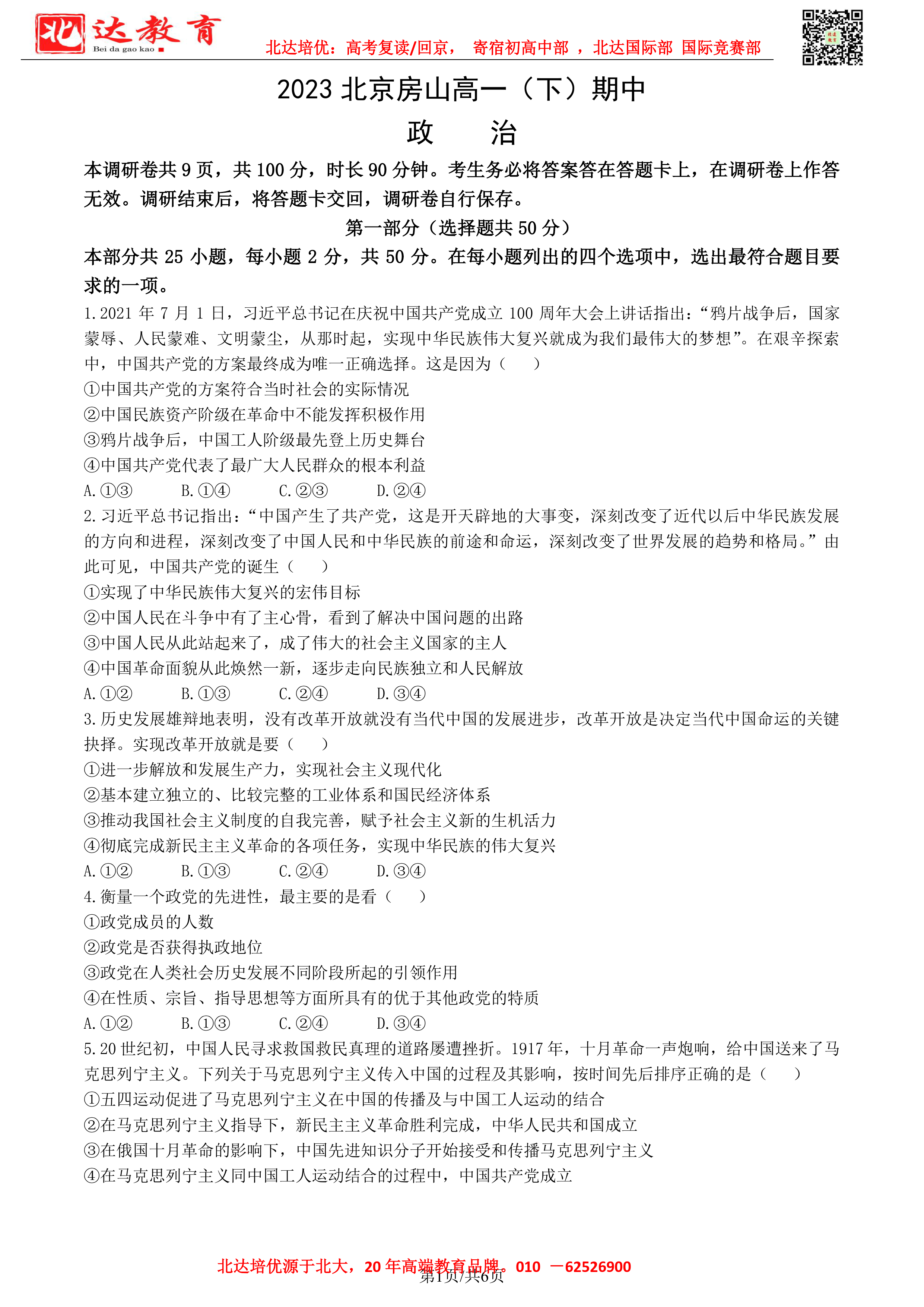 2022-2023学年北京各区高一年级下学期期中考试已开始,admw360高考复读学校整理了2022-2023学年北京房山高一(下)期中政治试题及答案,供同学们在线下载!