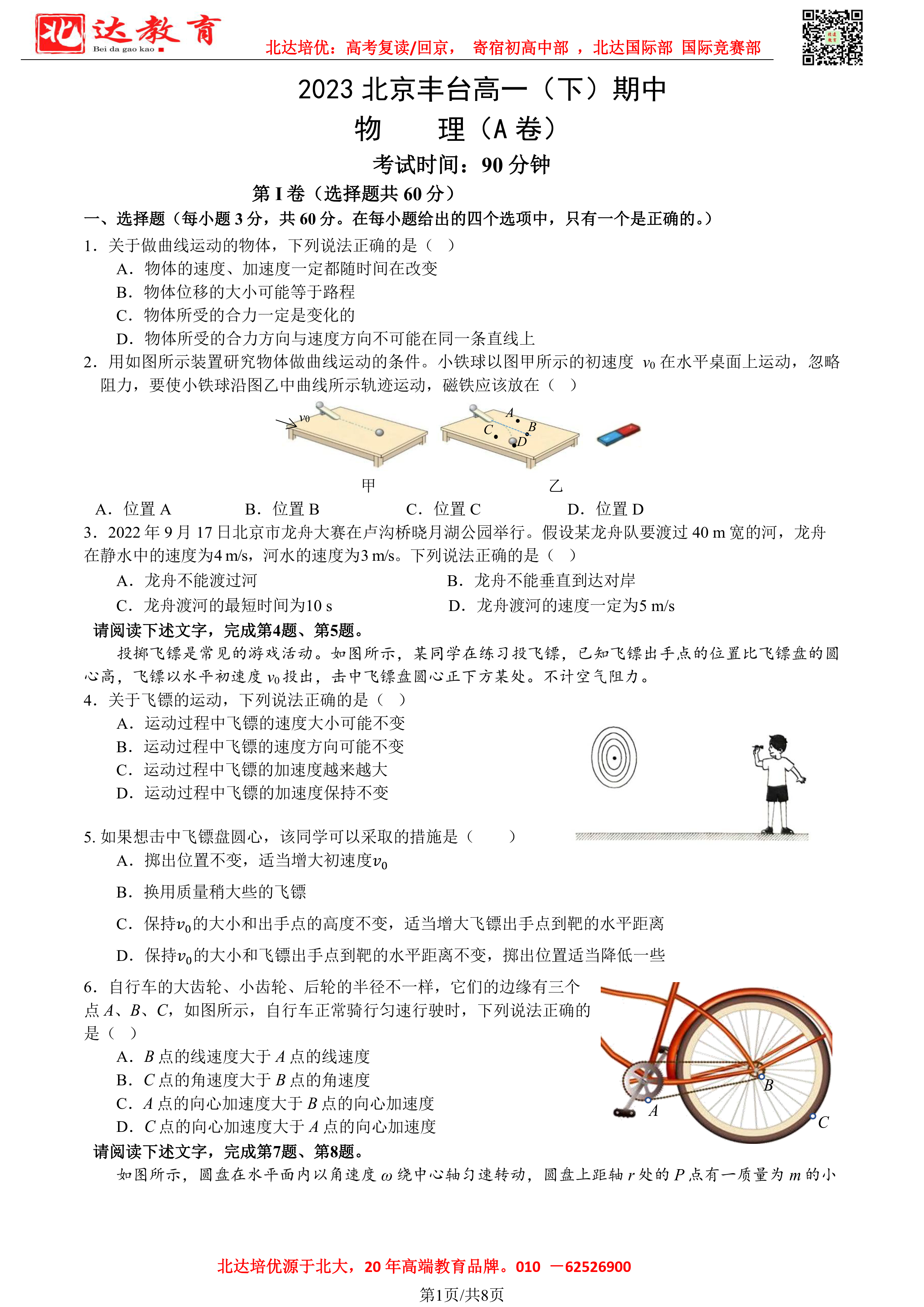 2022-2023学年北京各区高一年级下学期期中考试已开始,admw360高考复读学校整理了2022-2023学年北京丰台高一(下)期中物理(A卷)试题及答案,供同学们在线下载!