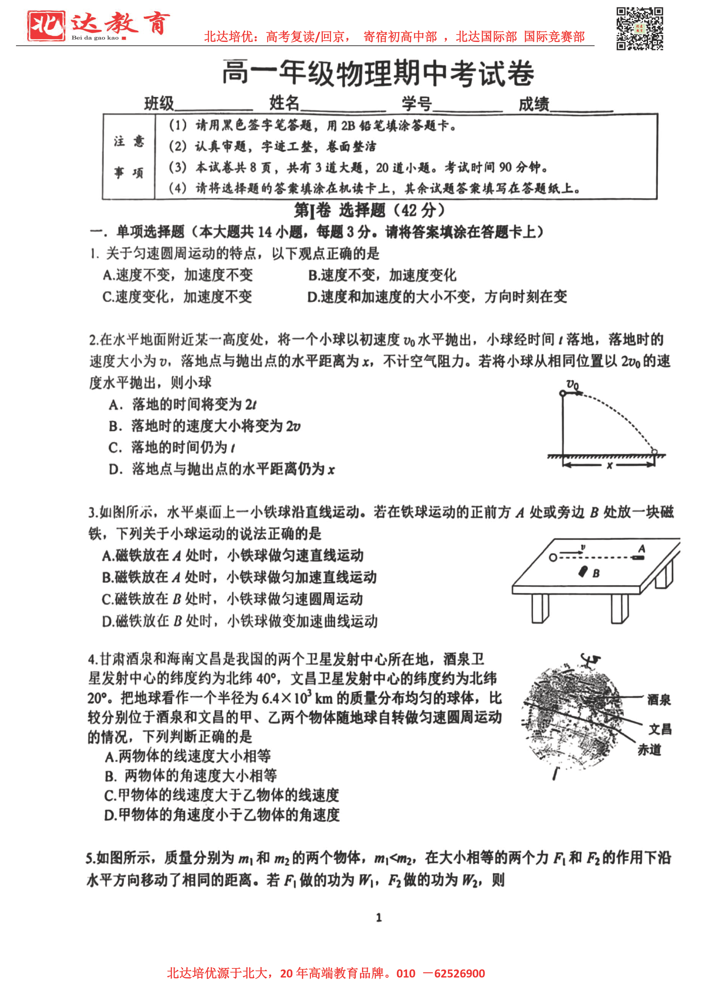 2022-2023学年北京各区高一年级下学期期中考试已开始,admw360高考复读学校整理了2022-2023学年北京景山学校高一(下)期中物理试题,供同学们在线下载!