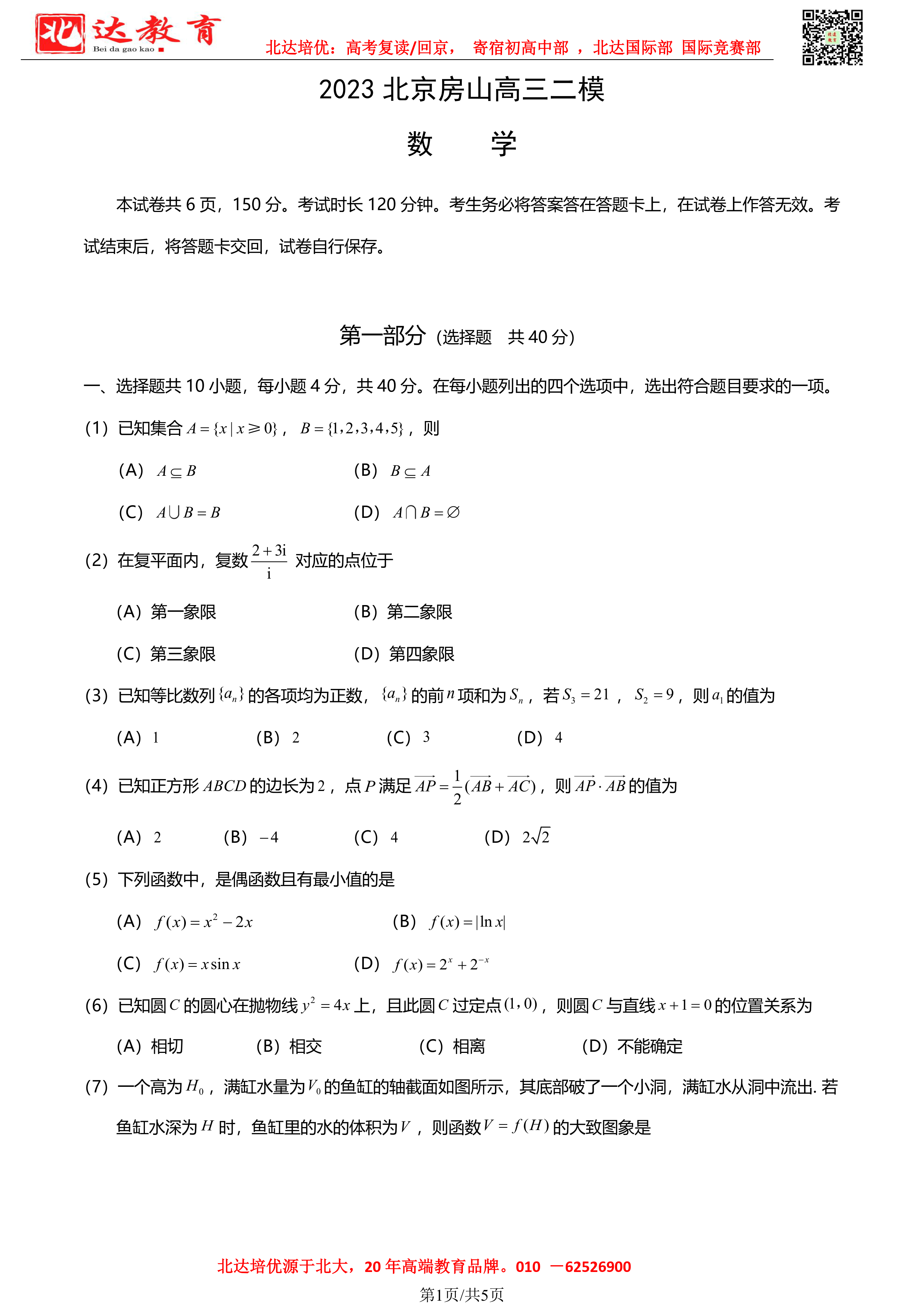 2023年北京房山区高三二模考试预于5月初进行,为了方便同学们查找相关试题及答案,admw360高考复读学校整理了2023年北京房山区高三二模数学试题及答案,附高清电子版,欢迎为大家下载分享~