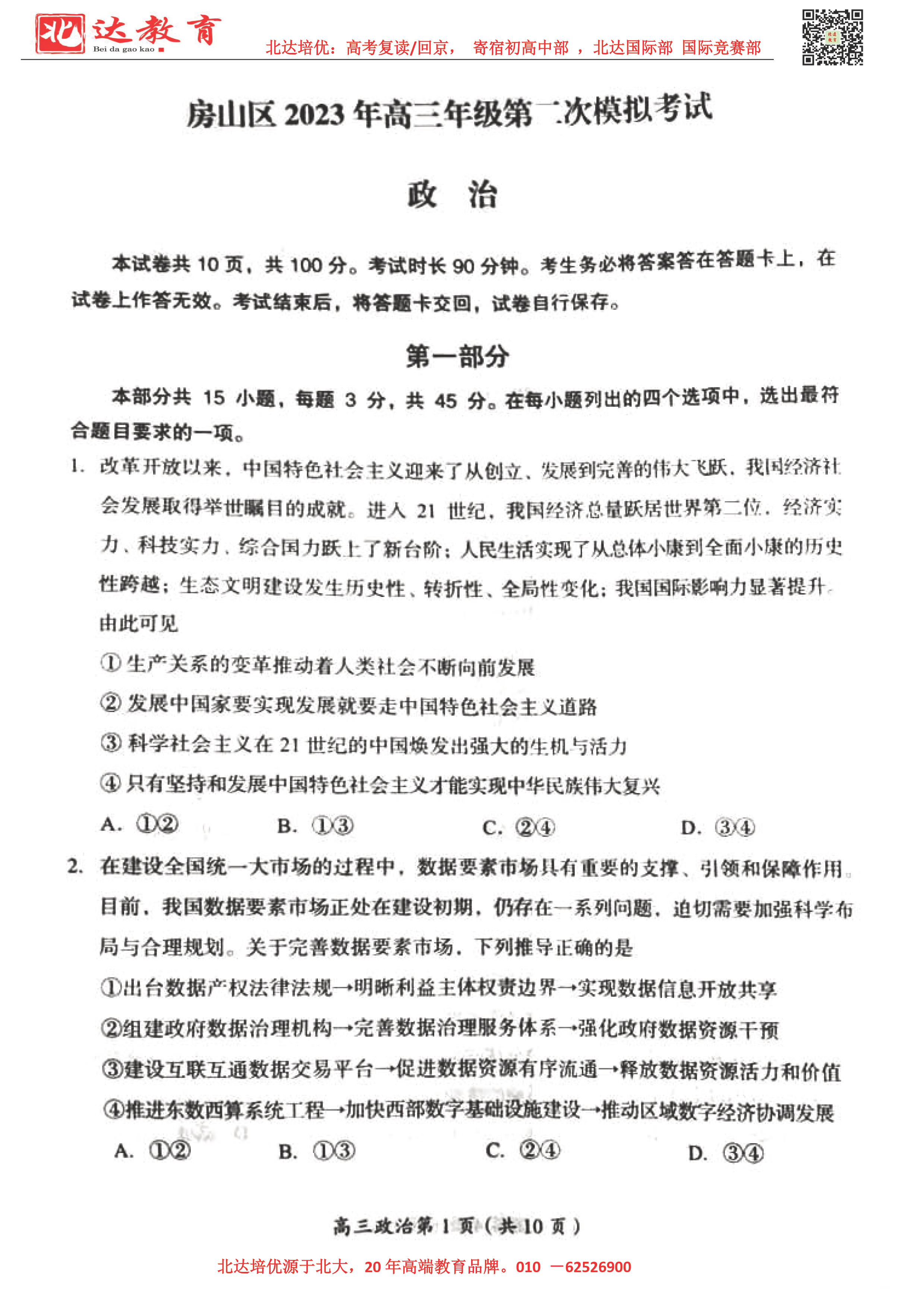 2023年北京房山区高三二模考试预于5月初进行,为了方便同学们查找相关试题及答案,admw360高考复读学校整理了2023年北京房山区高三二模政治试题及答案,附高清电子版,欢迎为大家下载分享~