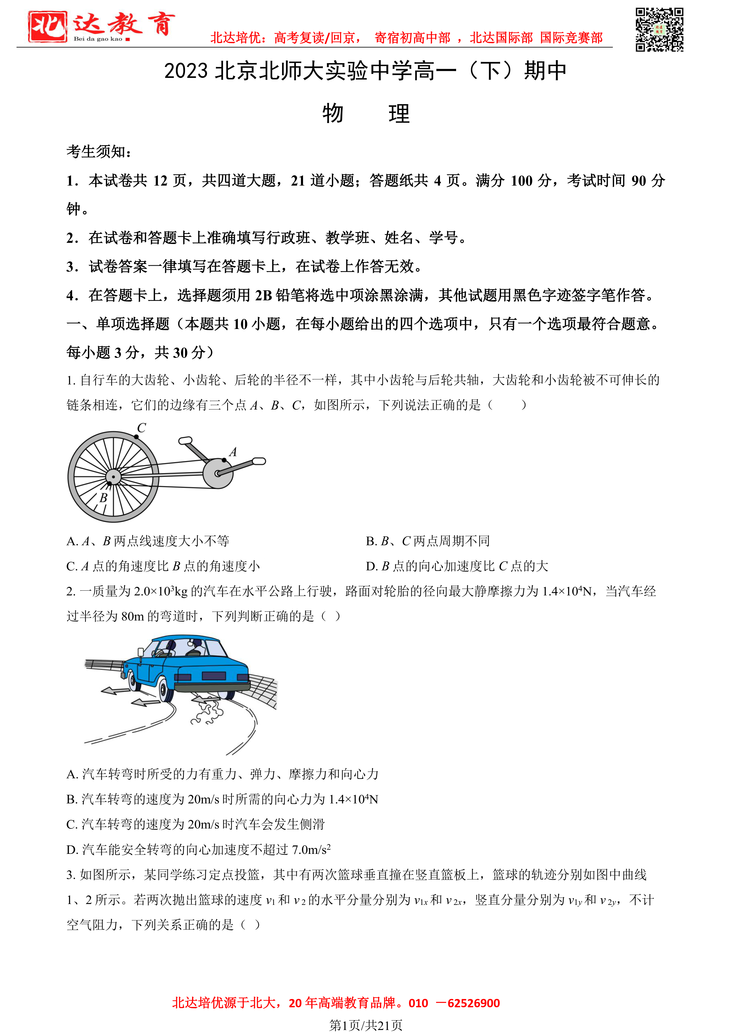 2022-2023学年北京各区高一年级下学期期中考试已开始,admw360高考复读学校整理了2022-2023学年北京北师大实验中学高一(下)期中物理试题,供同学们在线下载!