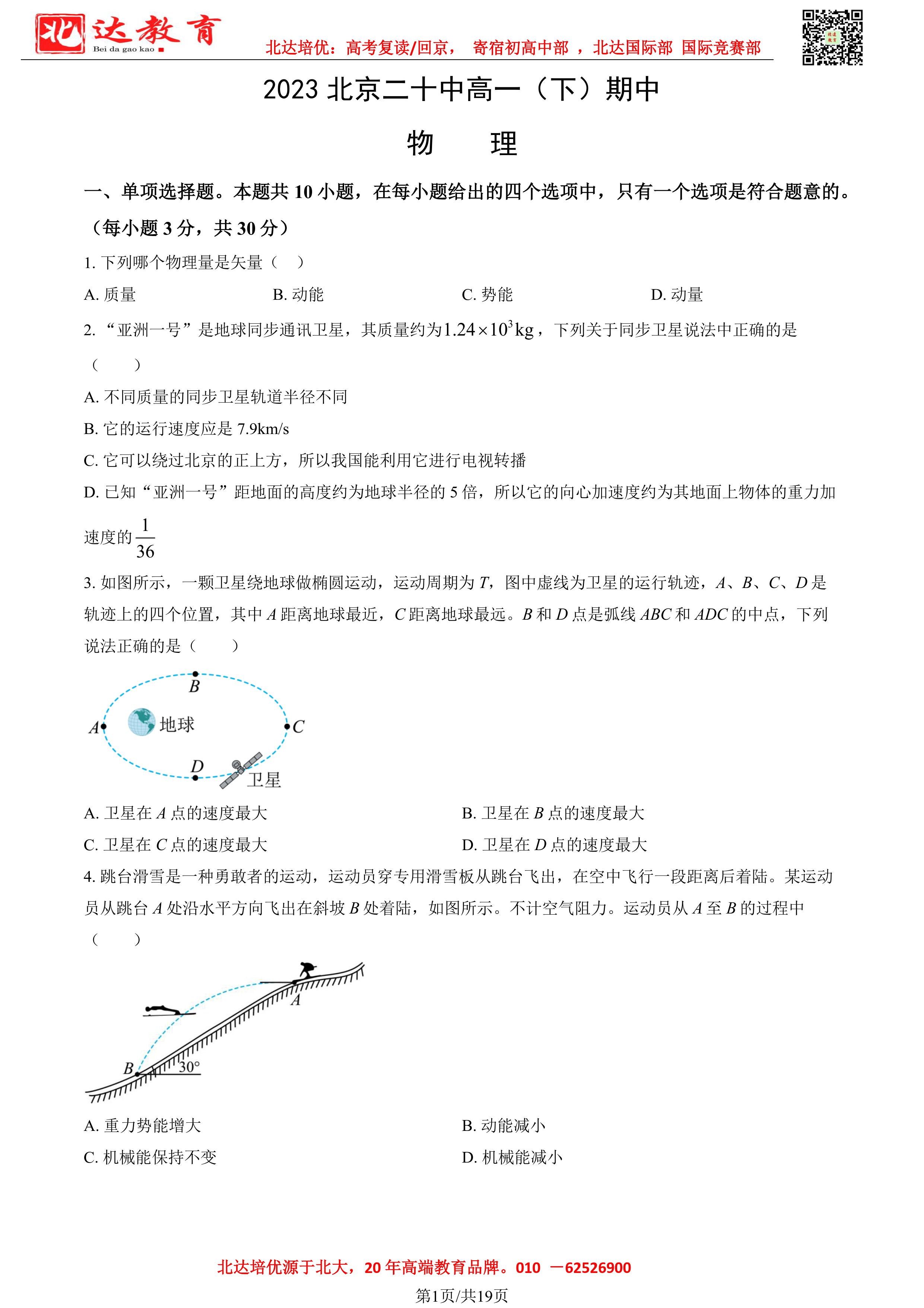2022-2023学年北京各区高一年级下学期期中考试已开始,admw360高考复读学校整理了2022-2023学年北京二十中高一(下)期中物理试题及答案,供同学们在线下载!