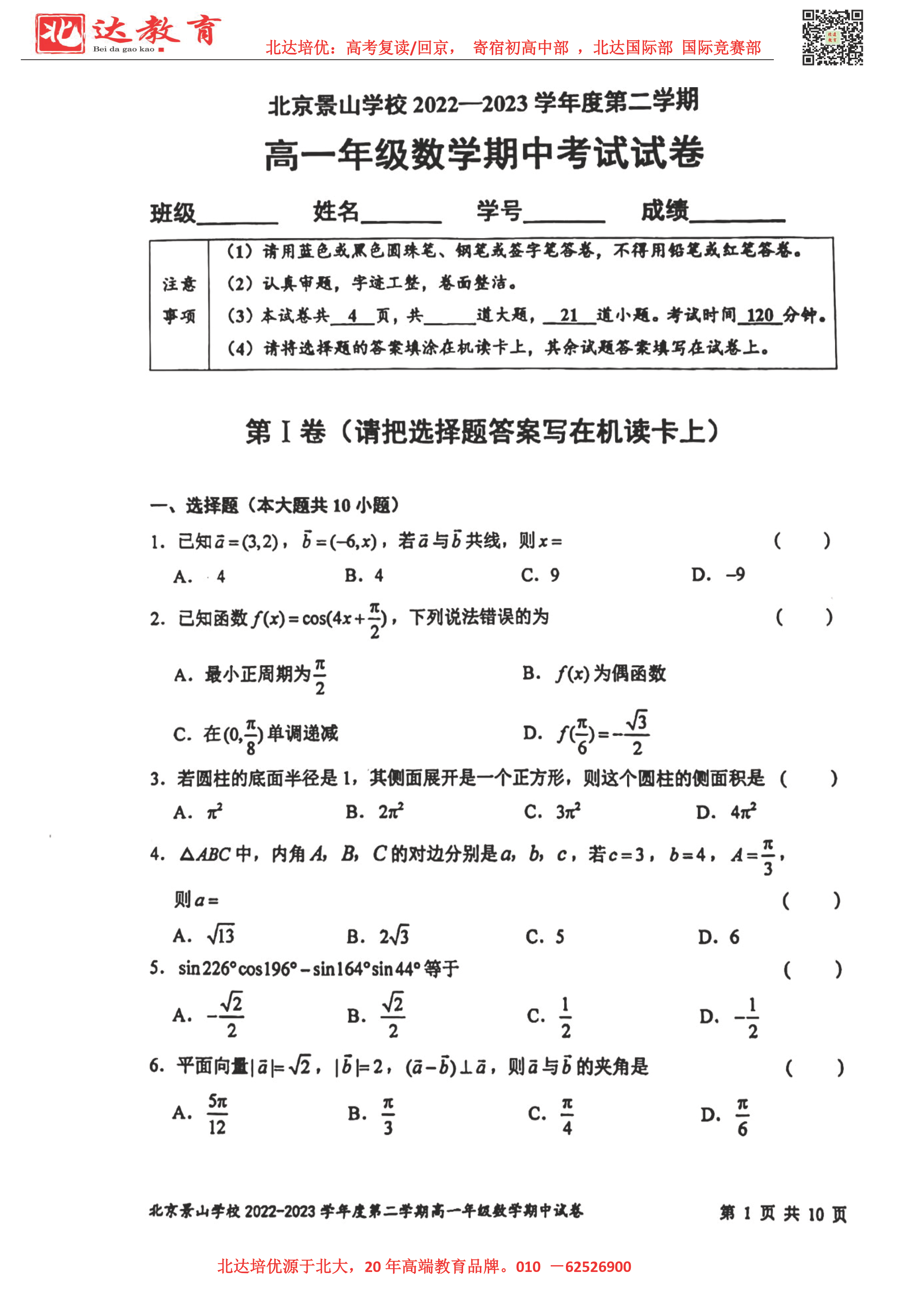 2022-2023学年北京各区高一年级下学期期中考试已开始,admw360高考复读学校整理了2022-2023学年北京景山学校高一(下)期中数学试题,供同学们在线下载!