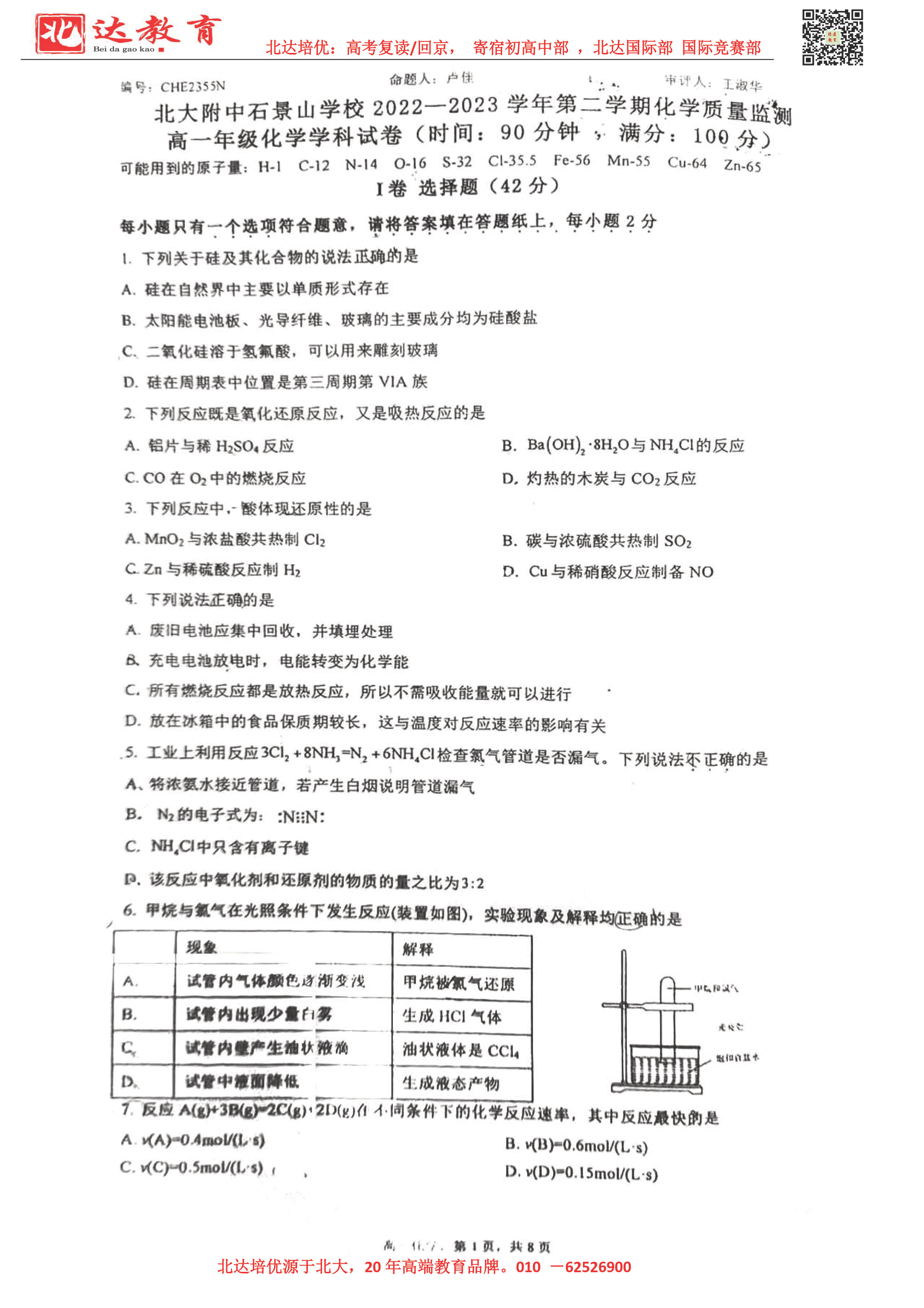 2022-2023学年北京各区高一年级下学期期中考试已开始,admw360高考复读学校整理了2022-2023学年北京北大附中石景山学校高一(下)期中化学试题及答案,供同学们在线下载!