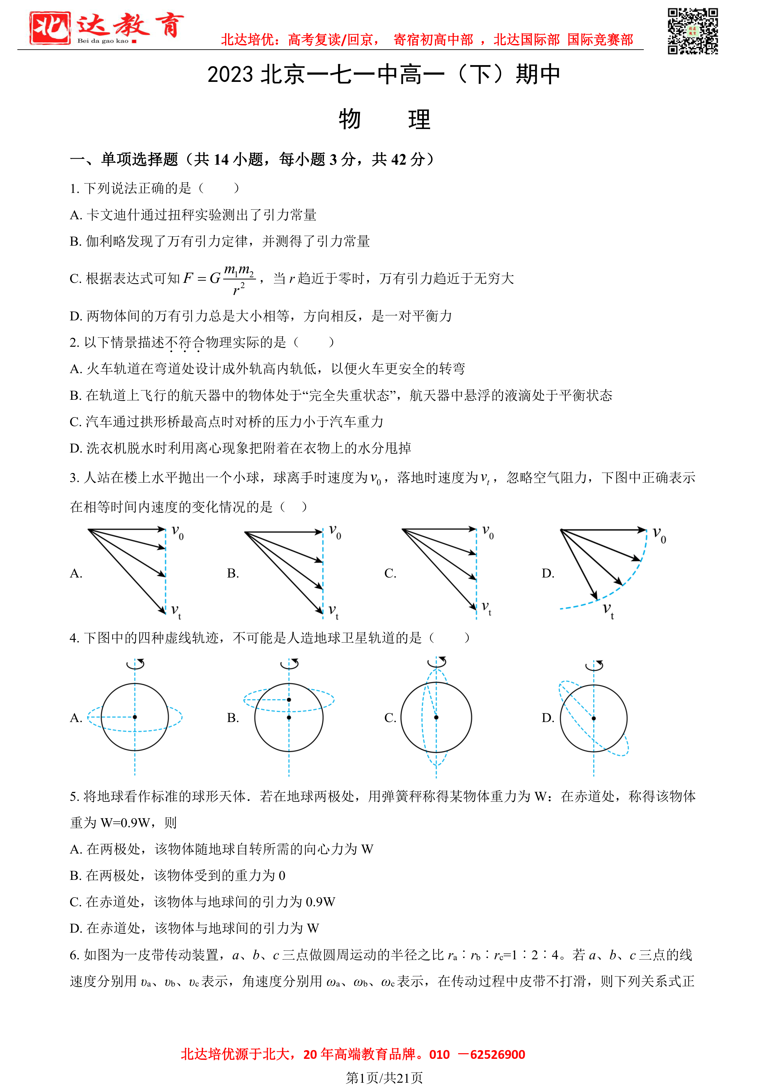 2022-2023学年北京各区高一年级下学期期中考试已开始,admw360高考复读学校整理了2022-2023学年北京一七一中高一(下)期中物理试题及答案,供同学们在线下载!