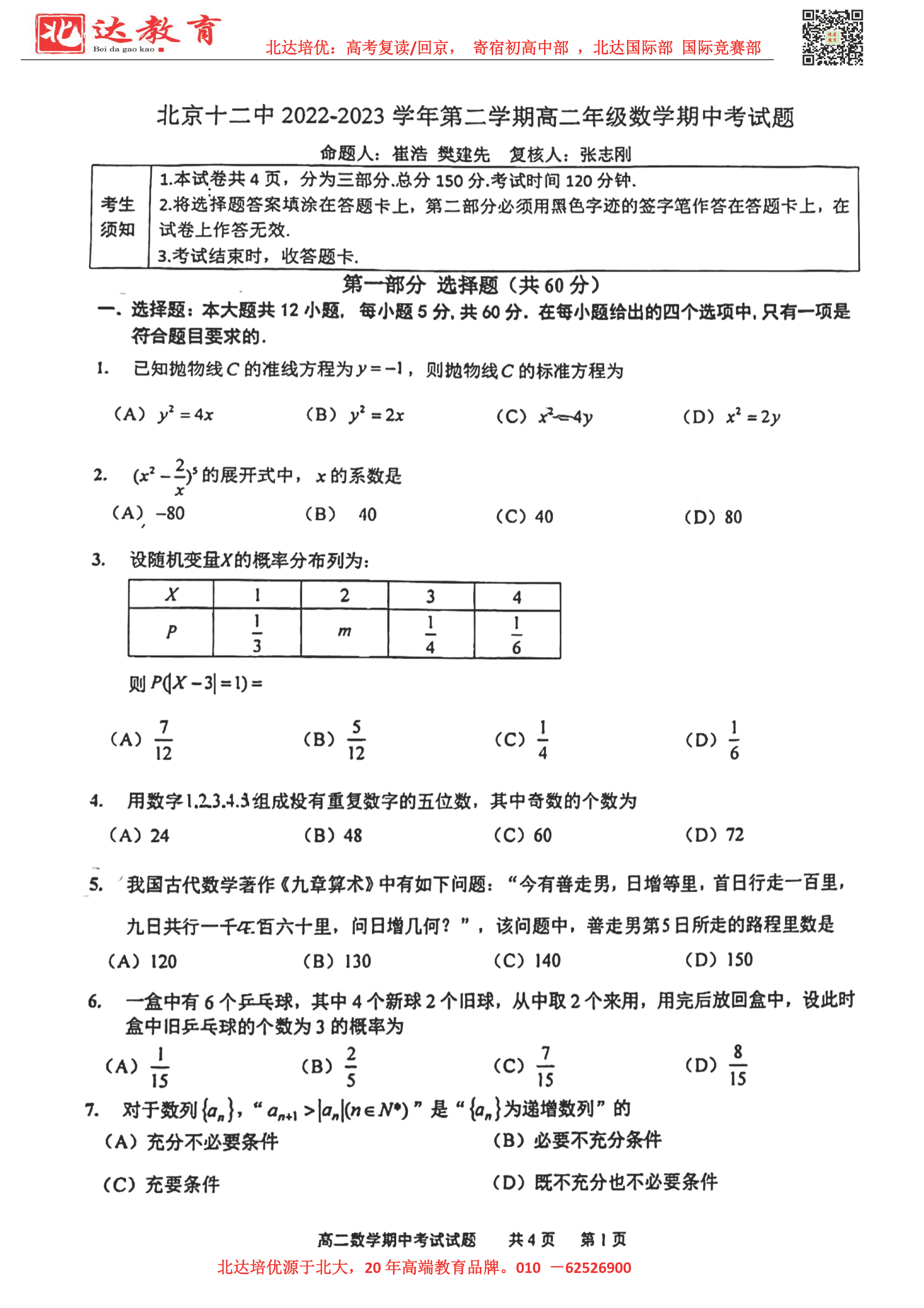 2022-2023学年北京各区高二年级下学期期中考试已开始,admw360高考复读学校整理了2022-2023学年北京十二中高二(下)期中数学试题及答案,供同学们在线下载!