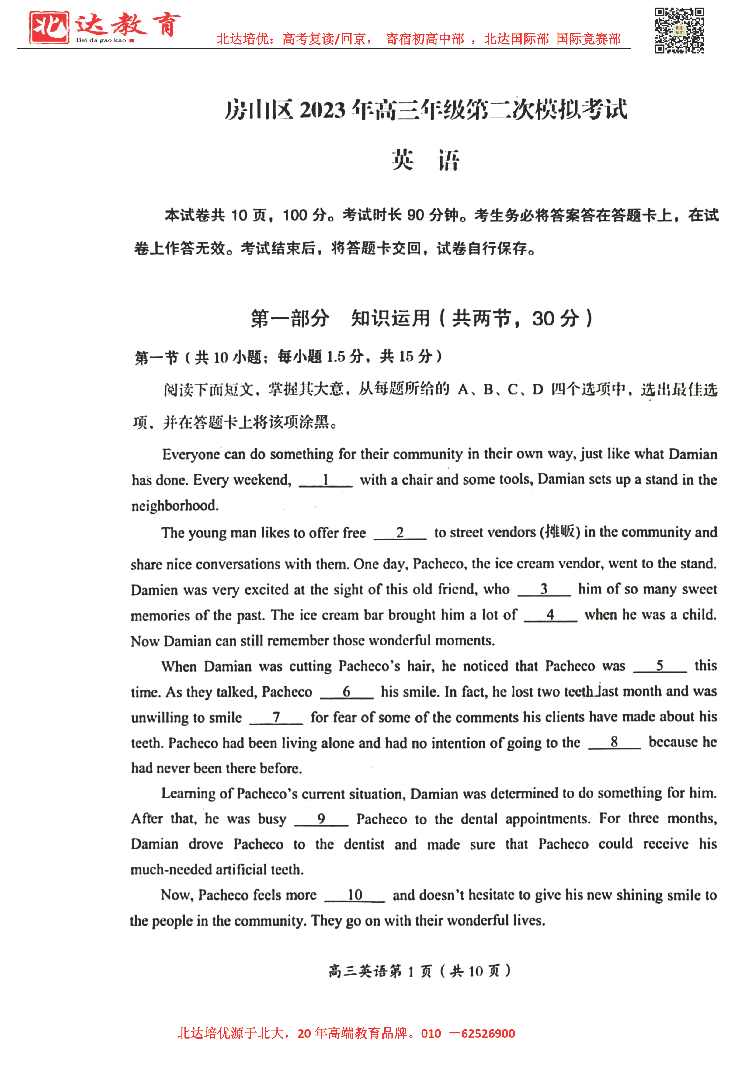 2023年北京房山区高三二模考试预于5月初进行,为了方便同学们查找相关试题及答案,admw360高考复读学校整理了2023年北京房山区高三二模英语试题及答案,附高清电子版,欢迎为大家下载分享~