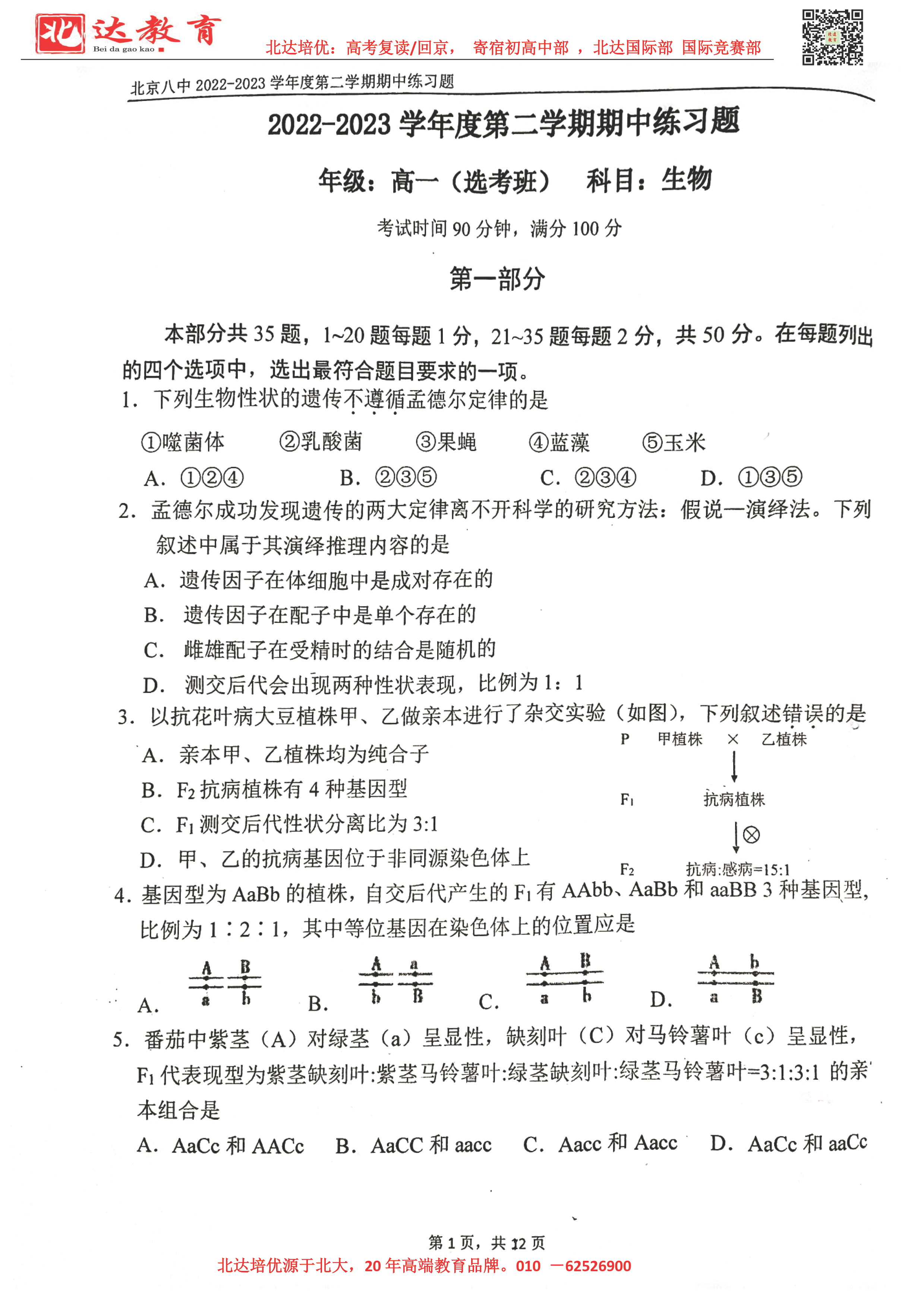 2022-2023学年北京各区高一年级下学期期中考试已开始,admw360高考复读学校整理了2022-2023学年北京八中高一(下)期中生物试题及答案,供同学们在线下载!