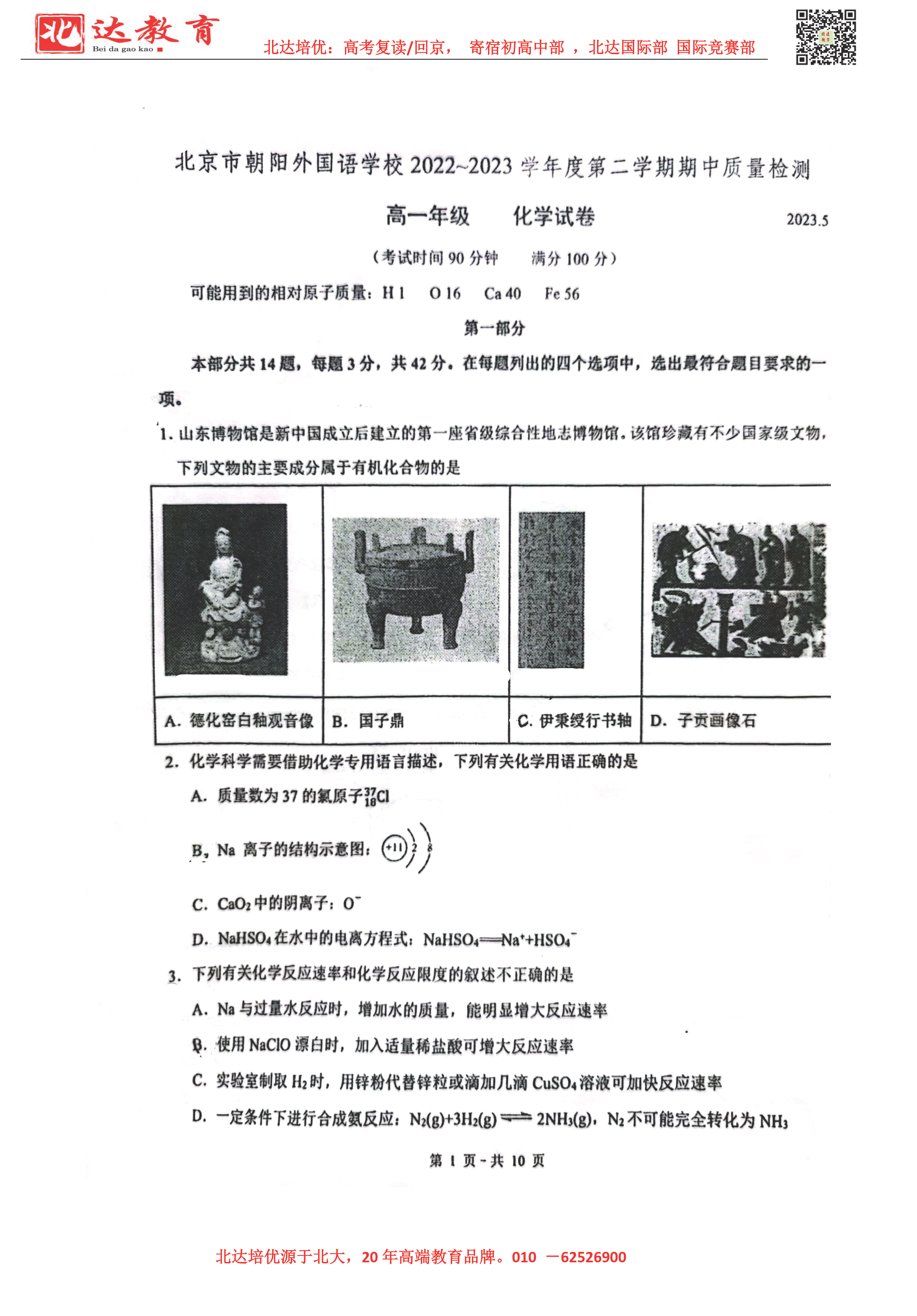 2022-2023学年北京各区高一年级下学期期中考试已开始,admw360高考复读学校整理了2022-2023学年北京朝阳外国语学校高一(下)期中化学试题及答案,供同学们在线下载!