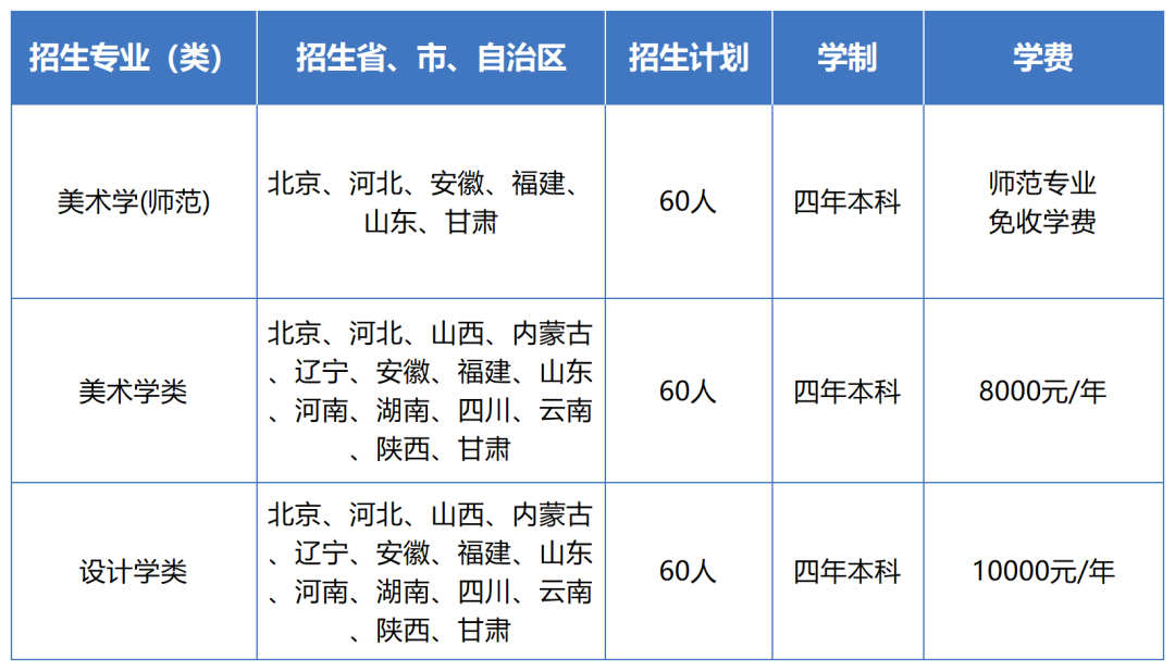 3.美术学类和设计学类为大类招生,录取时不分专业(方向)。美术学类包含专业有:美术学(艺术市场)、绘画(油画)、绘画(国画);设计学类包含的专业有:视觉传达设计、环境设计、数字媒体艺术。