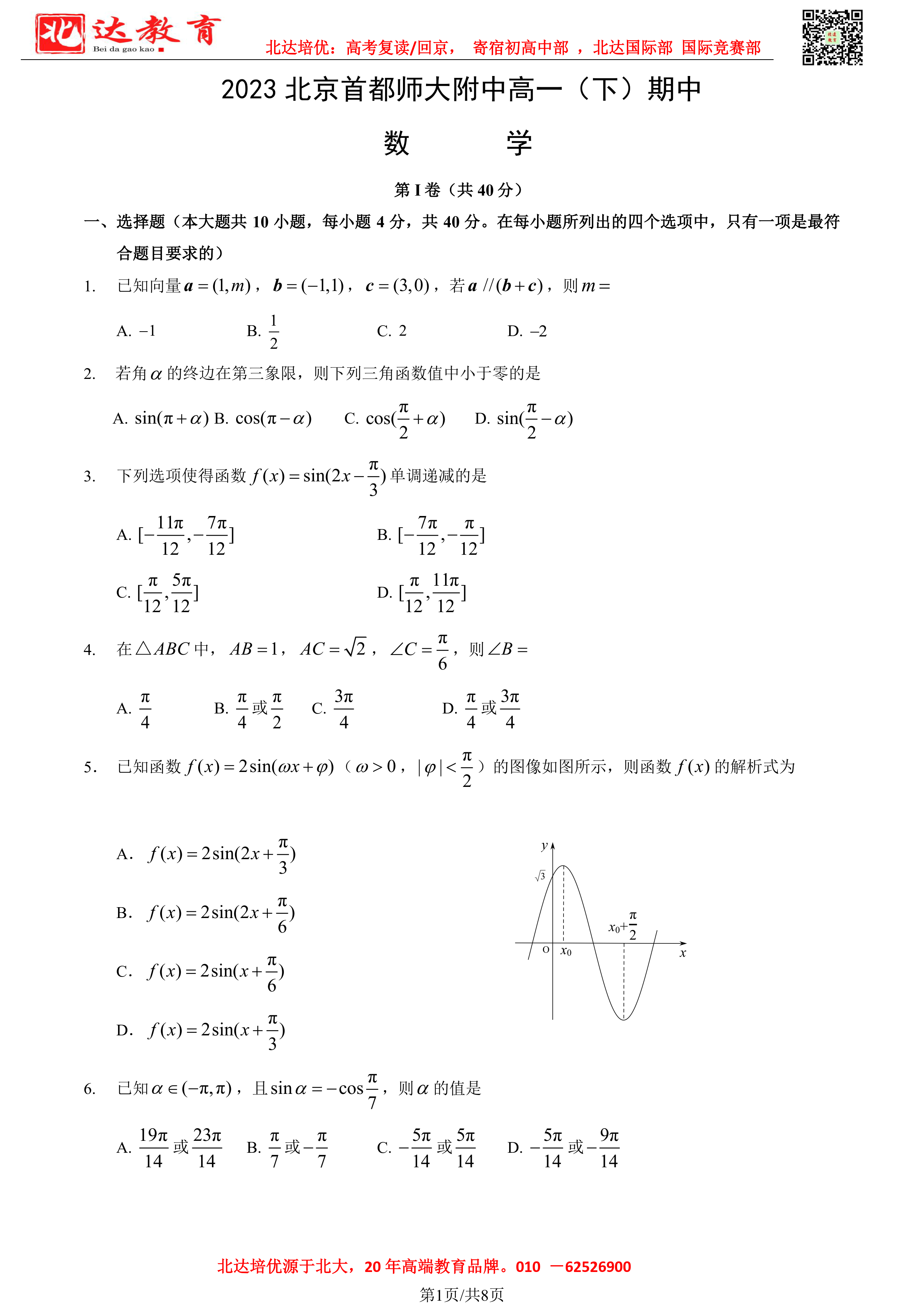 2022-2023学年北京各区高一年级下学期期中考试已开始,admw360高考复读学校整理了2022-2023学年北京首都师大附中高一(下)期中数学试题及答案,供同学们在线下载!