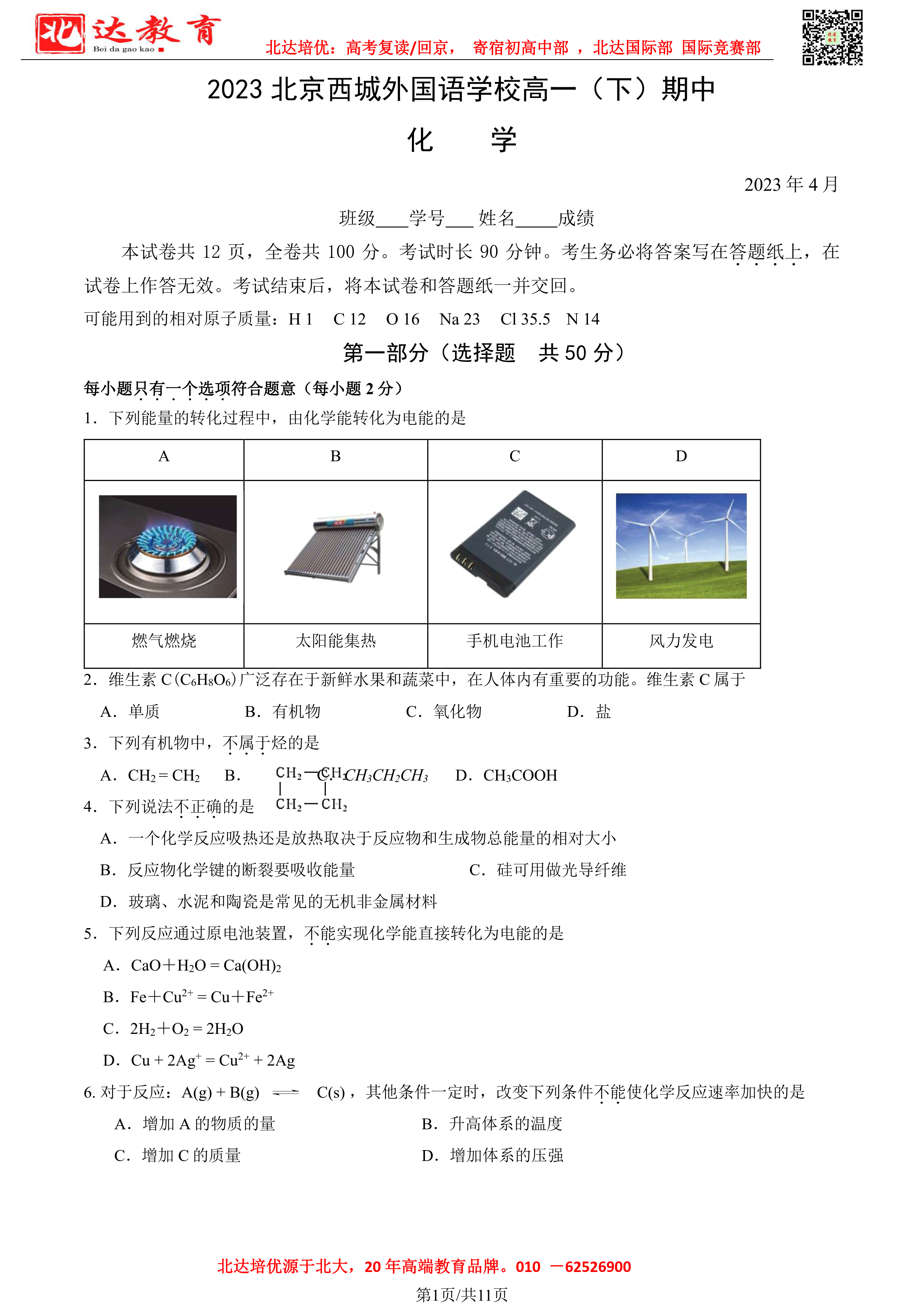 2022-2023学年北京各区高一年级下学期期中考试已开始,admw360高考复读学校整理了2022-2023学年北京西城外国语学校高一(下)期中化学试题及答案,供同学们在线下载!