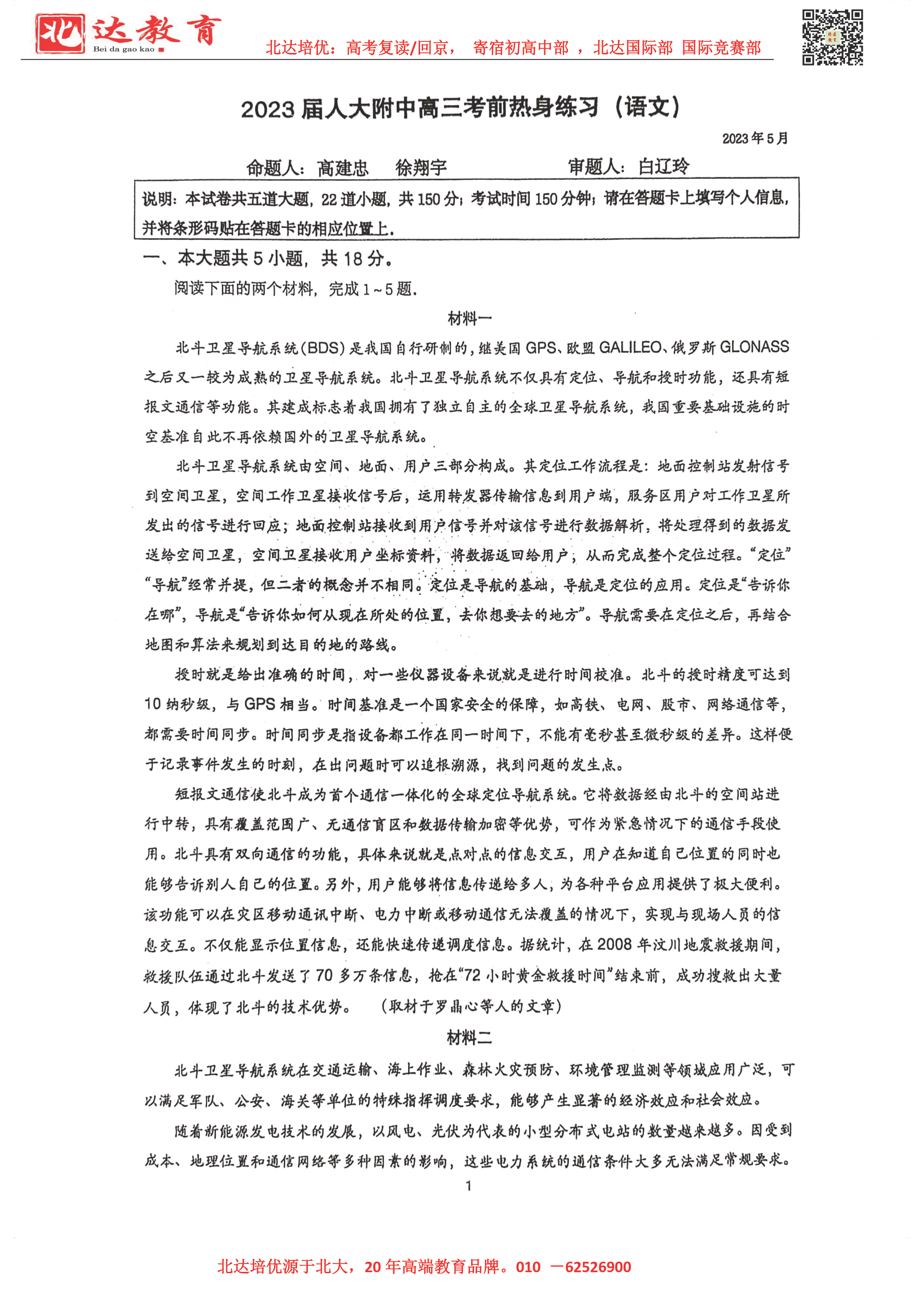 近日,北京人大附中高三年级进行了三模测试,为此,admw360高考复读学校整理了语文科目试题、答案相关内容,详情如下: