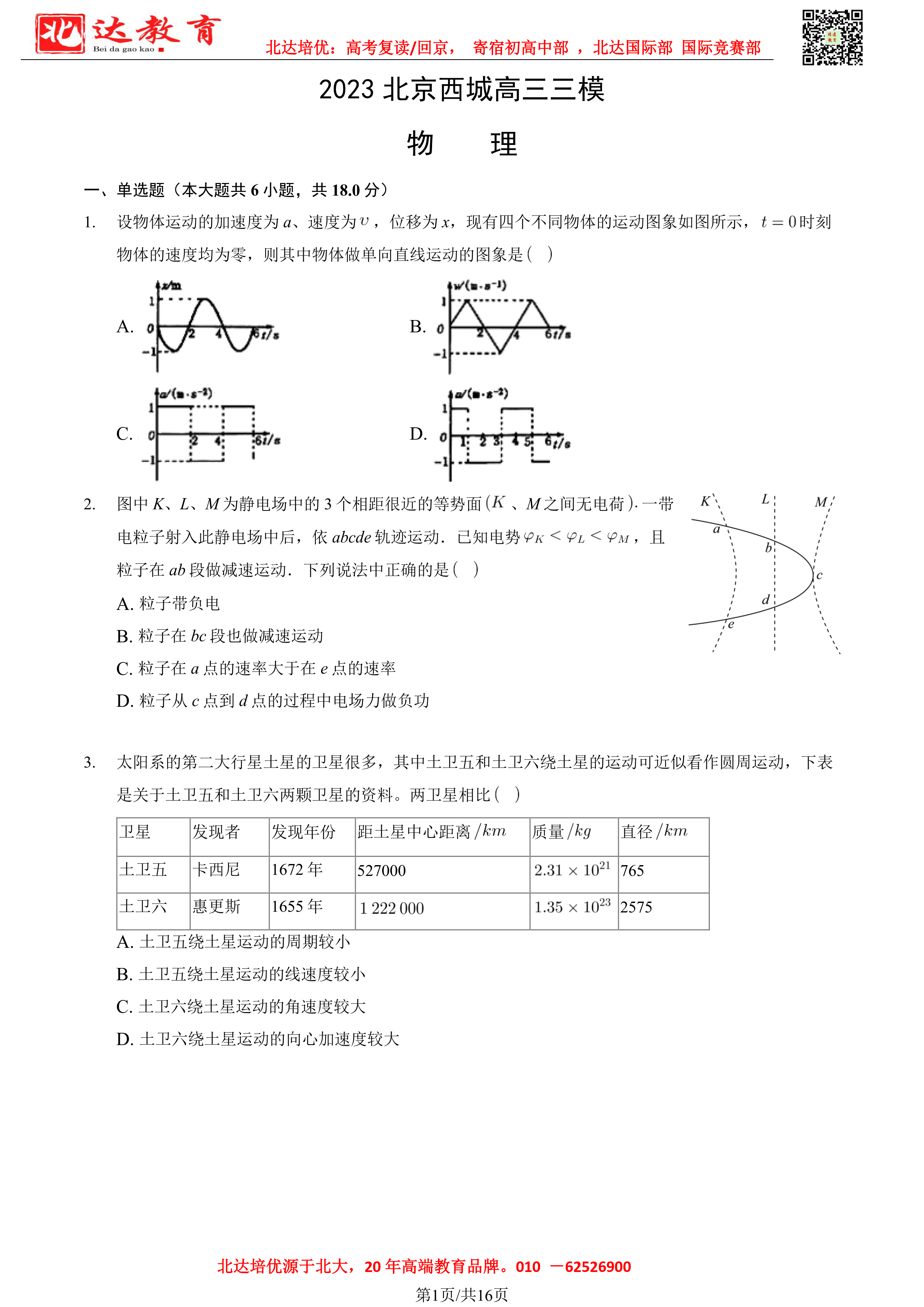 近日,北京西城区高三年级进行了三模测试,为此,北京高考复读学校整理了物理科目试题、答案相关内容,详情如下: