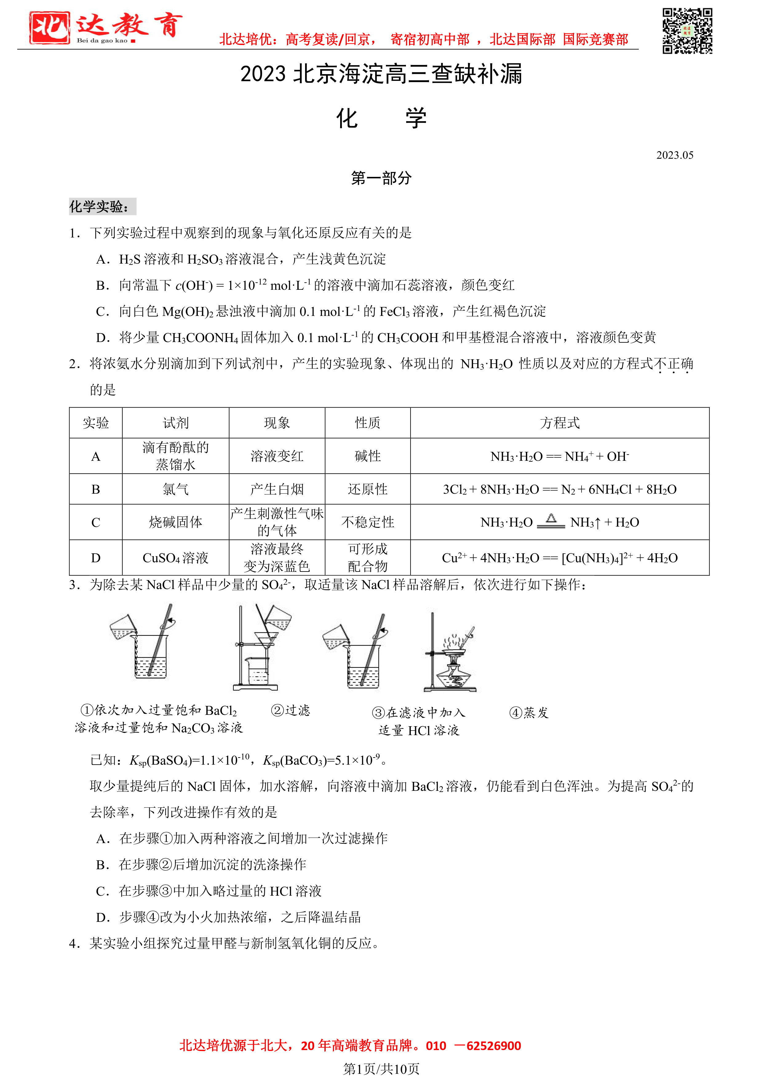 2023年北京海淀高三二模考试已结束,admw360高考复读学校整理了化学查漏补缺材料试题及答案,分享给同学们。详情如下: