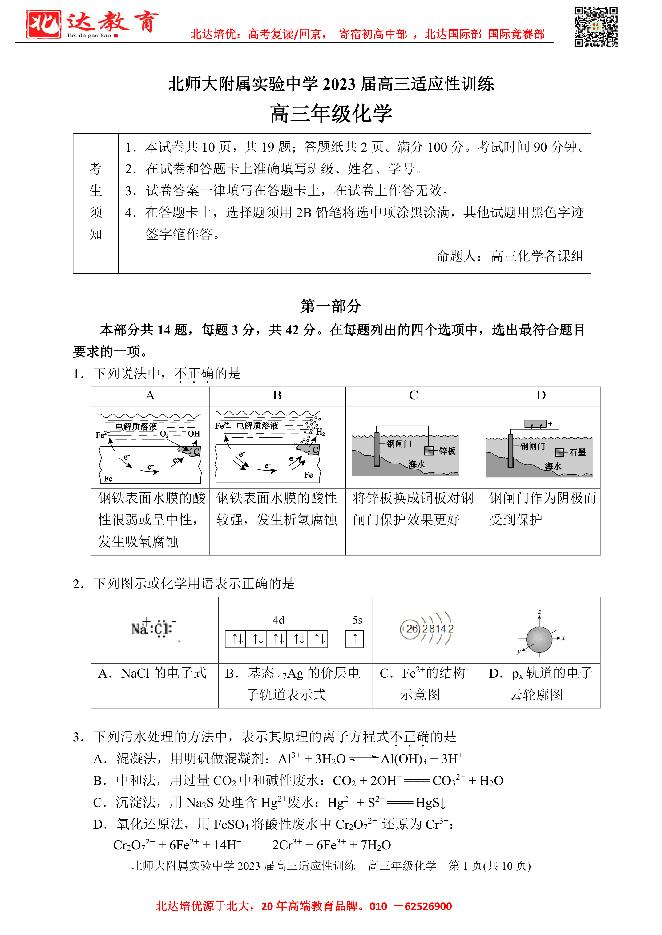 立即下载:2023年北京北师大实验中学高三三模化学试题及答案