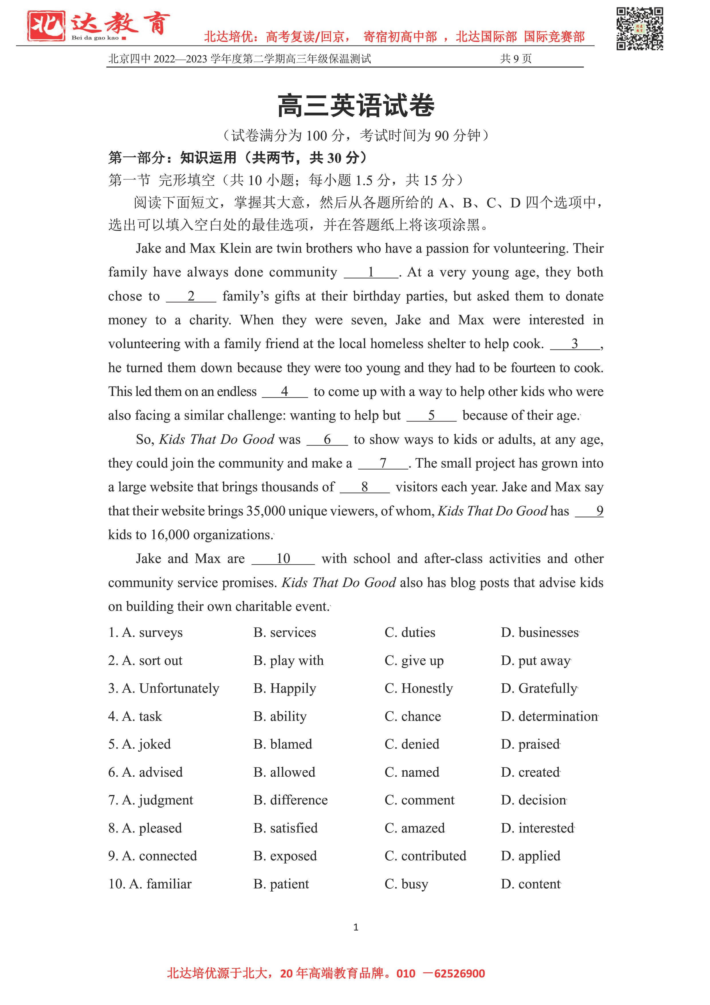 近日,北京四中高三年级进行了三模测试,为此,admw360高考复读学校整理了英语科目试题、答案相关内容,详情如下: