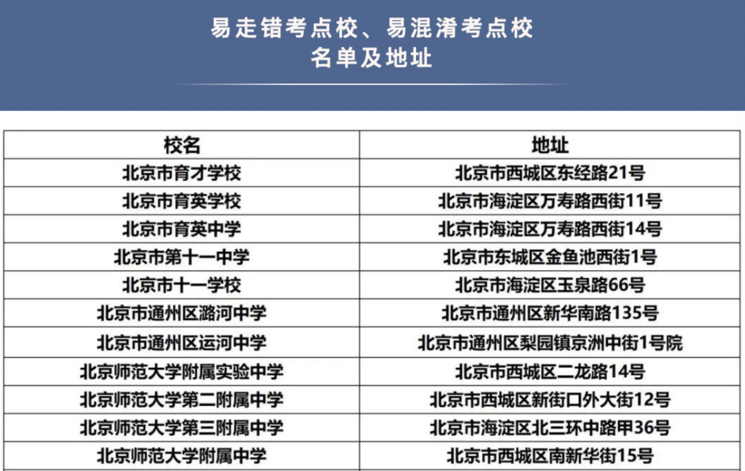 有些考点校的名称只是一字之差,容易混淆,考生要细心分辨清楚,重点看清考点校的地址。比如,北京市育才学校在西城区,北京市育英学校在海淀区;北京市第十一中学在东城区,北京市十一学校在海淀区。考生要看清准考证上的信息,提前了解考点所在位置。