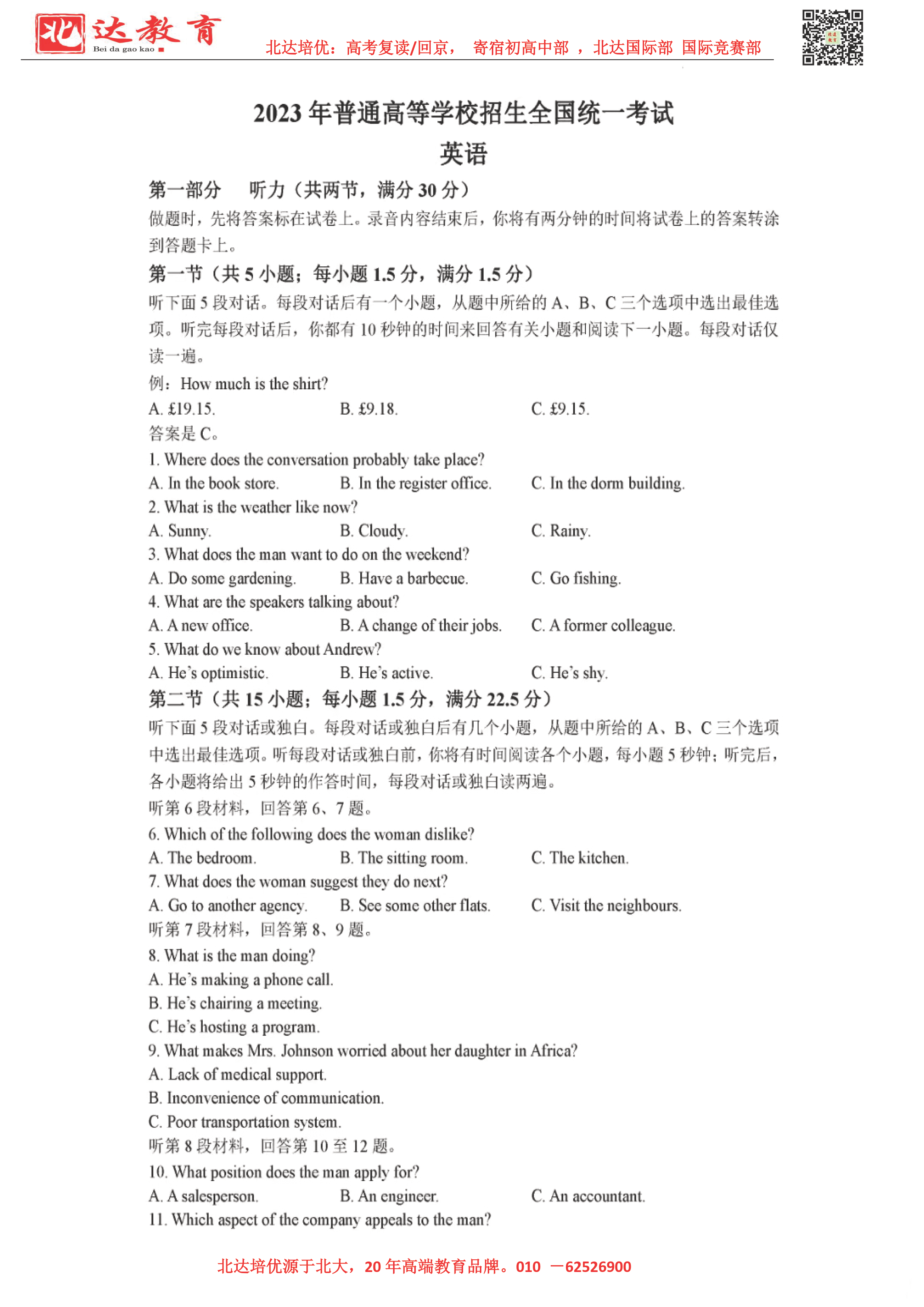 2023全国高考考试已结束,为了方便同学们查找高考试题答案进行估分,admw360复读学校整理了全国乙卷英语真题及答案解析,分享给同学们。详情如下: