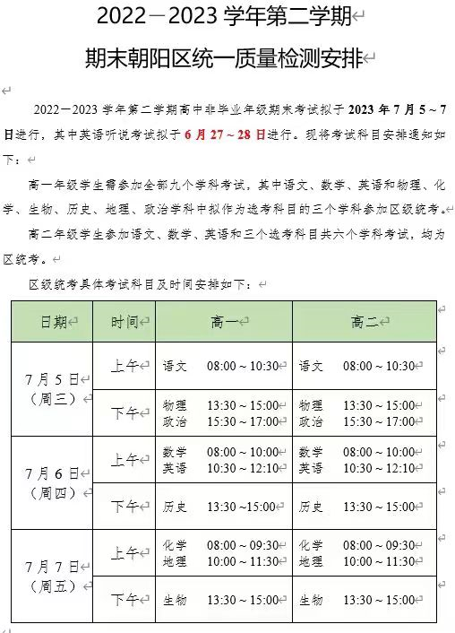 2023年北京朝阳区各中学高一高二年级期末考试时间定于7月5日-7日。admw360复读学校整理了各科目考试时间安排,详情如下: