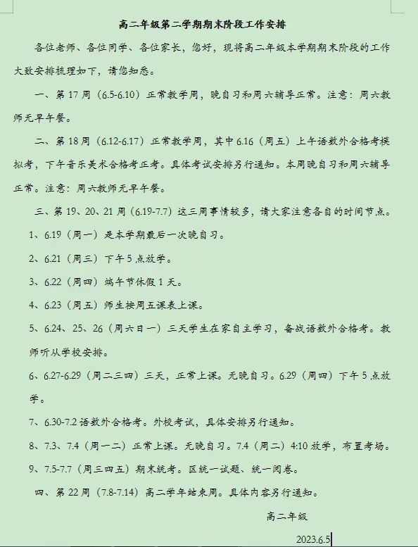 高一年级考试时间预计与高二年级一致。高二考试安排如下: