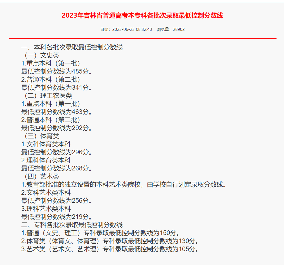 2023年吉林普通高等学校招生录取最低控制分数线