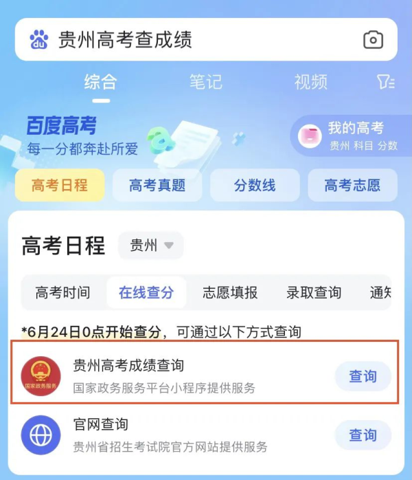 考生可通过手机端“百度APP”,搜索栏输入“贵州高考查成绩”进行查询。