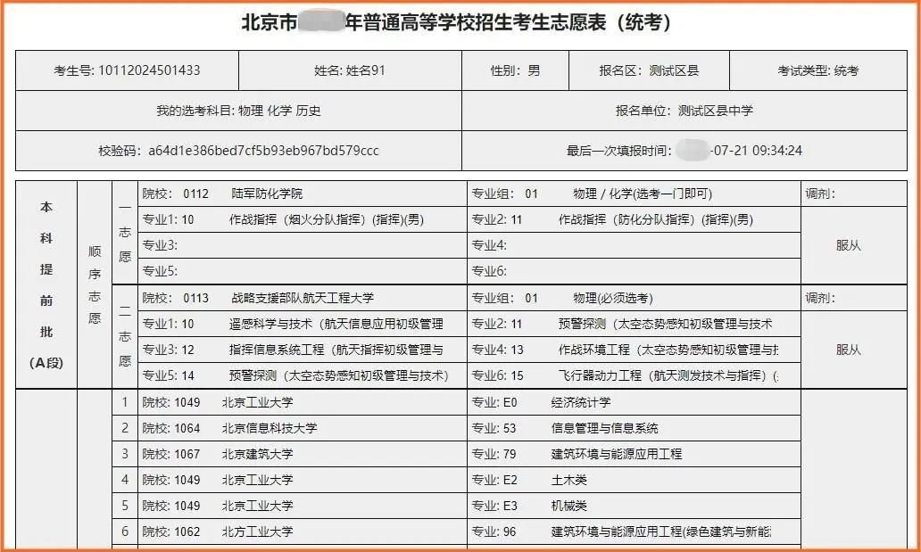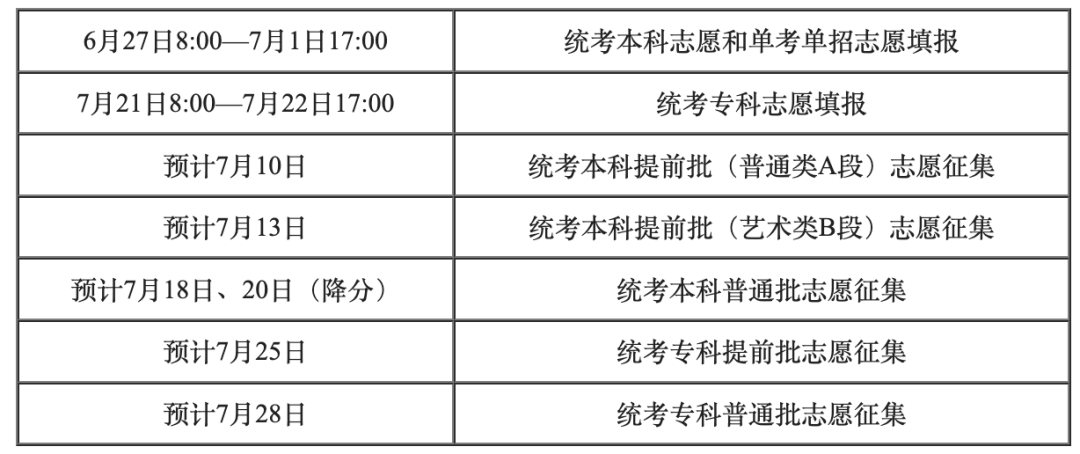 7. 7月1日17时至7月4日17时考生通过系统可查看本人的统考本科或者单考单招志愿填报信息。