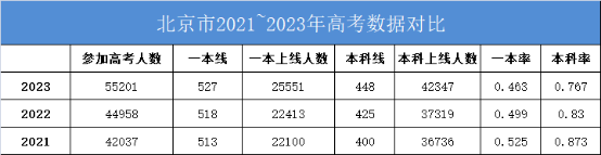 由此可得出,北京近三年一本分数线及本科分数线在逐年上涨,同时一本率在逐年下降。同样,本科分数线也在逐年提高,本科率在逐年下降,业内人士指出,随着北京高考人数越来越多,高校扩招速度可能跟不上考生人数涨幅,上本科及一本的比例可能会逐年下降。
